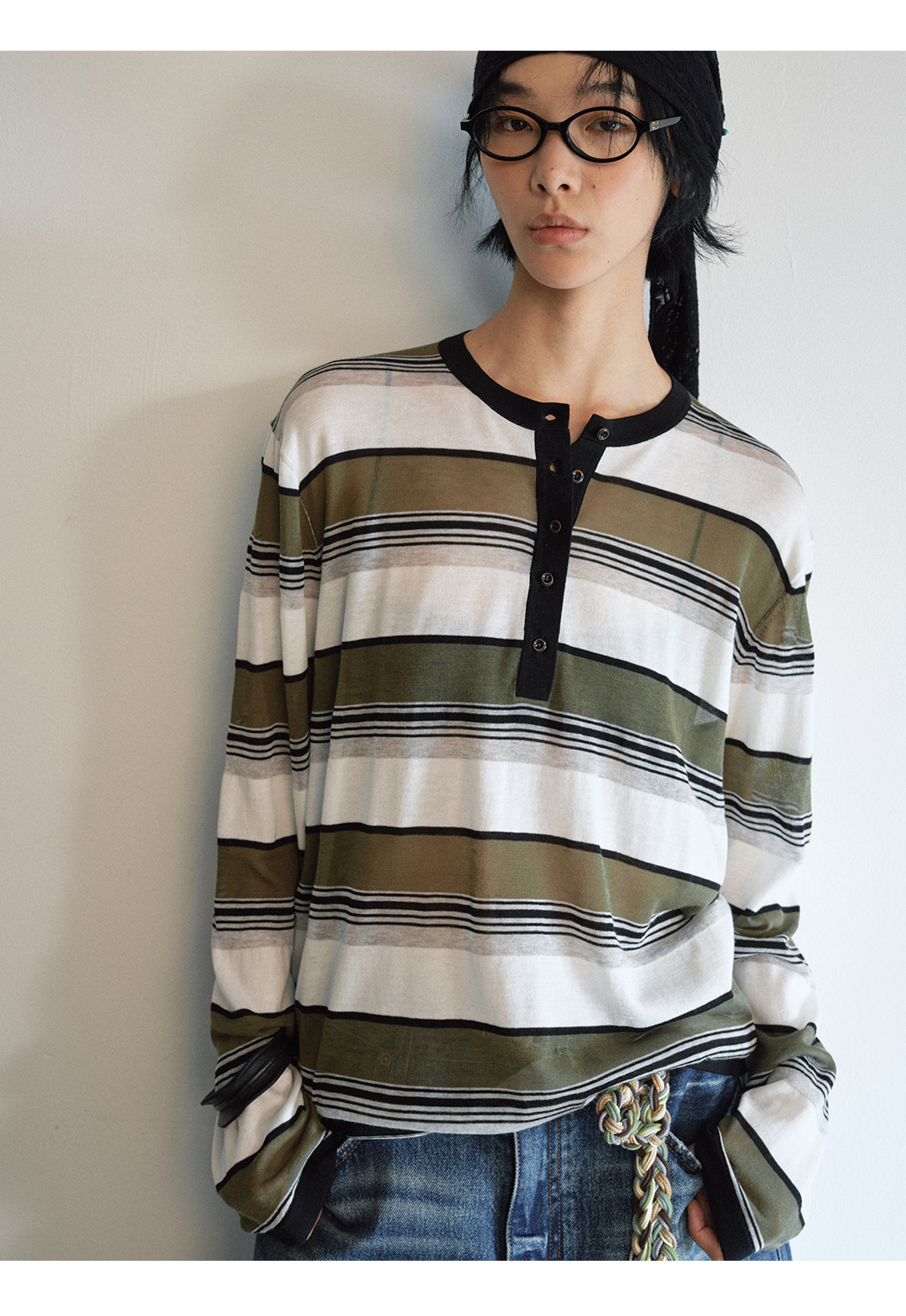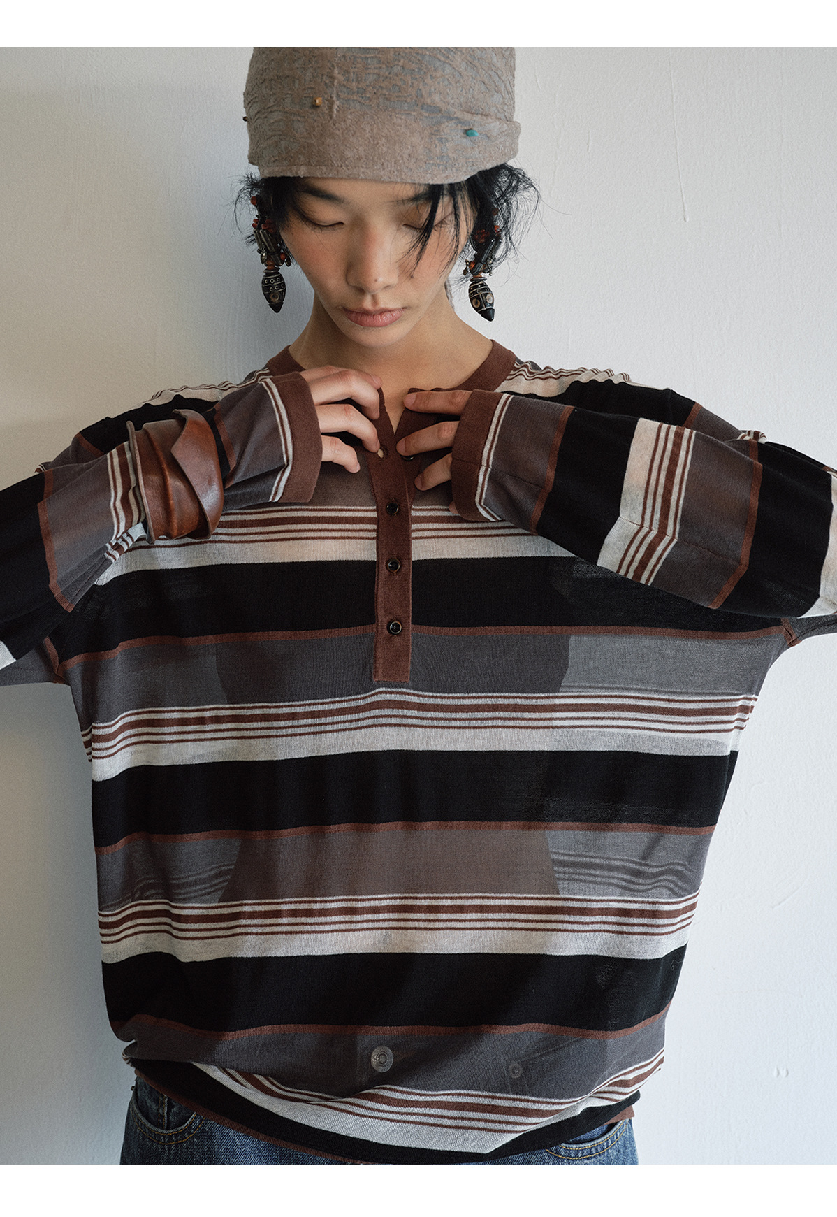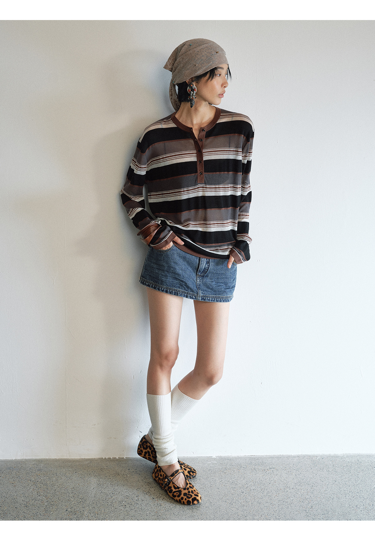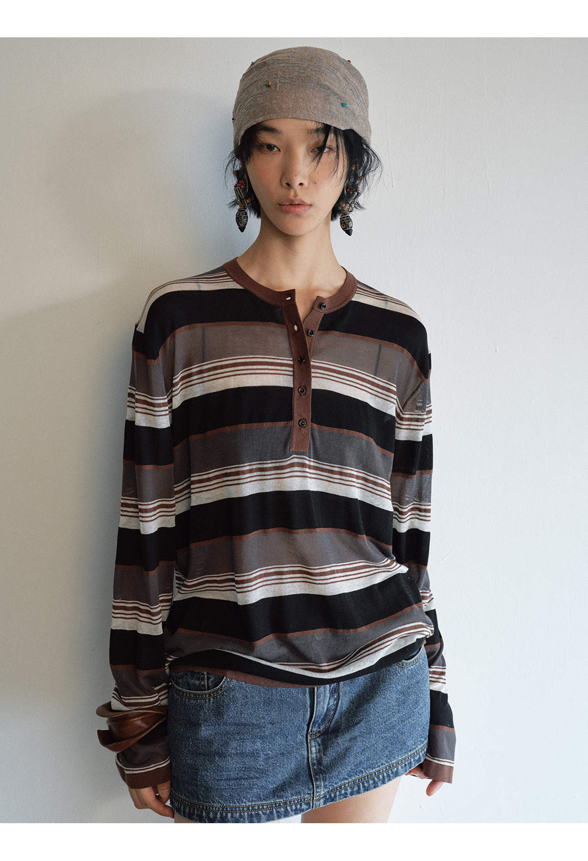 [시시] 초가을 신상 텐셀 레트로 스트라이프 니트 얇고 투명한 긴팔 헨리넥 탑 여성용 V9264