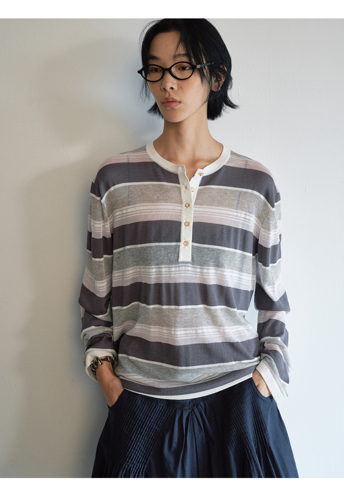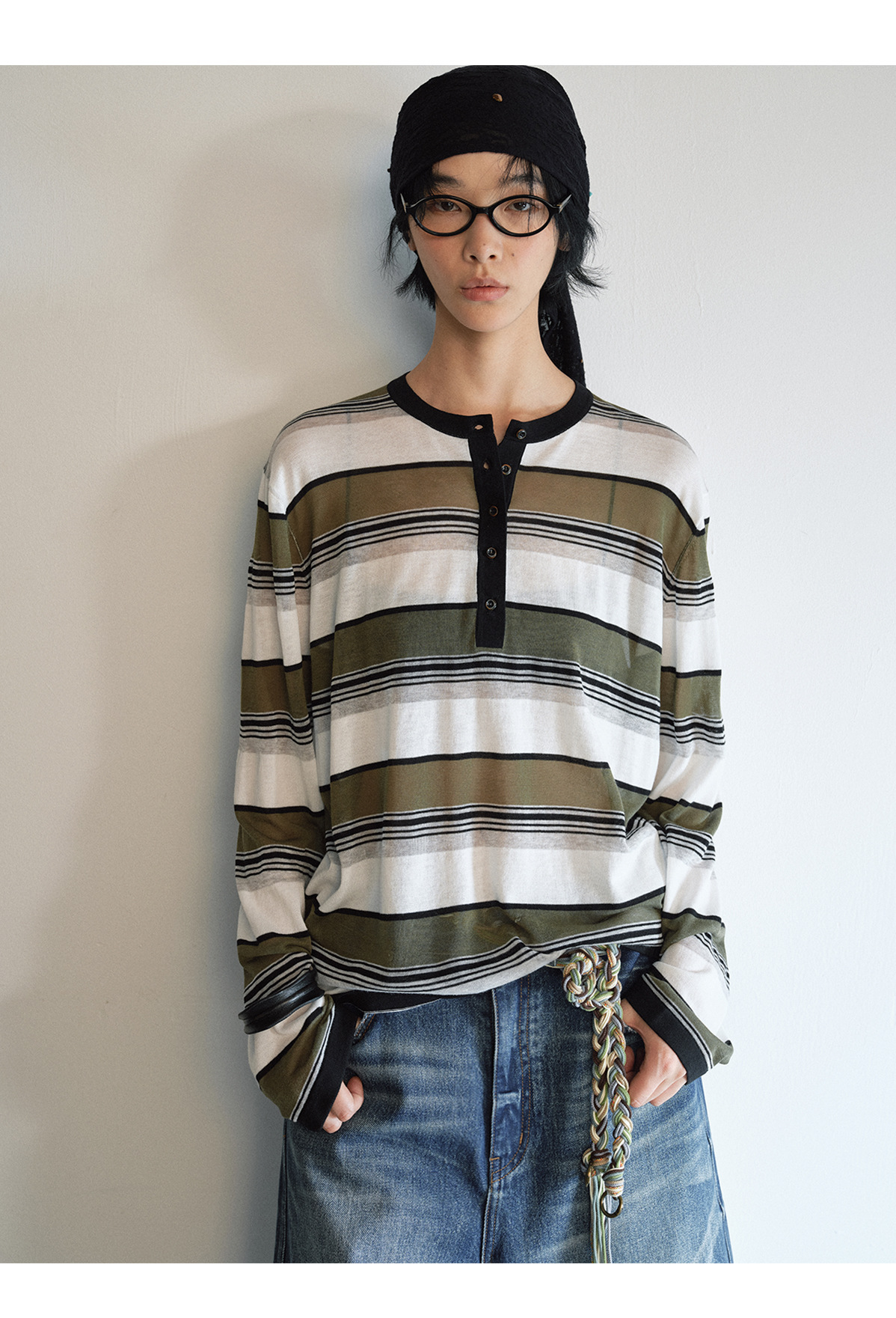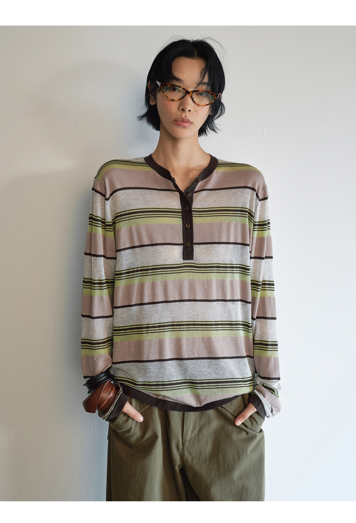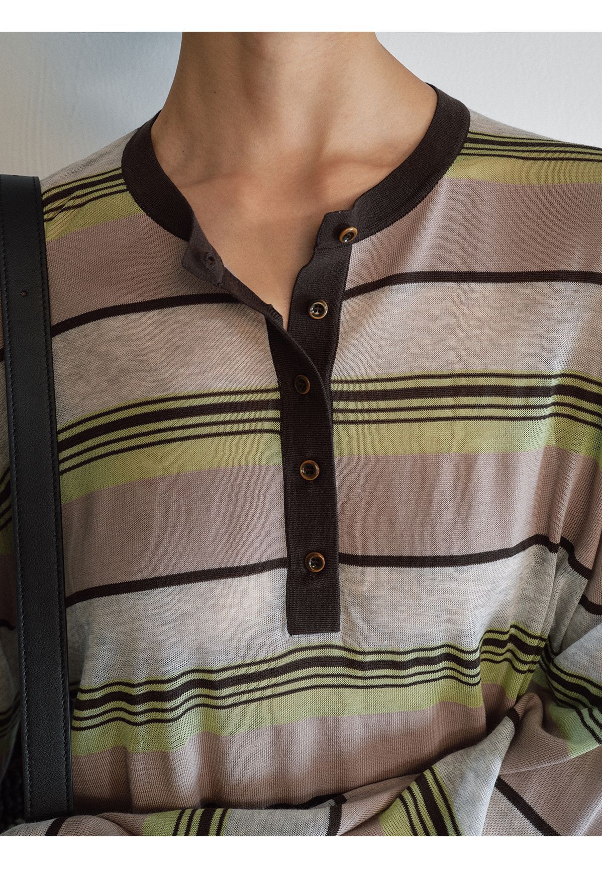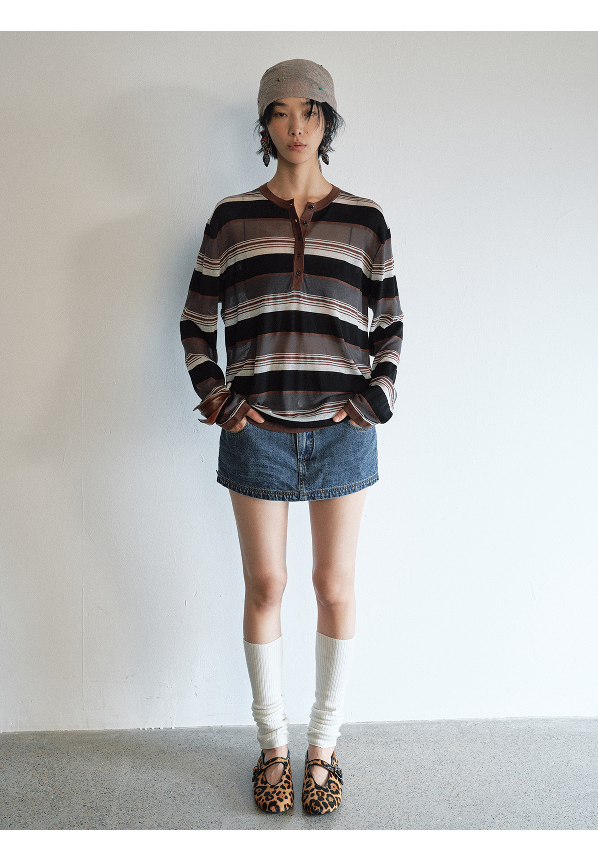 [시시] 초가을 신상 텐셀 레트로 스트라이프 니트 얇고 투명한 긴팔 헨리넥 탑 여성용 V9264
