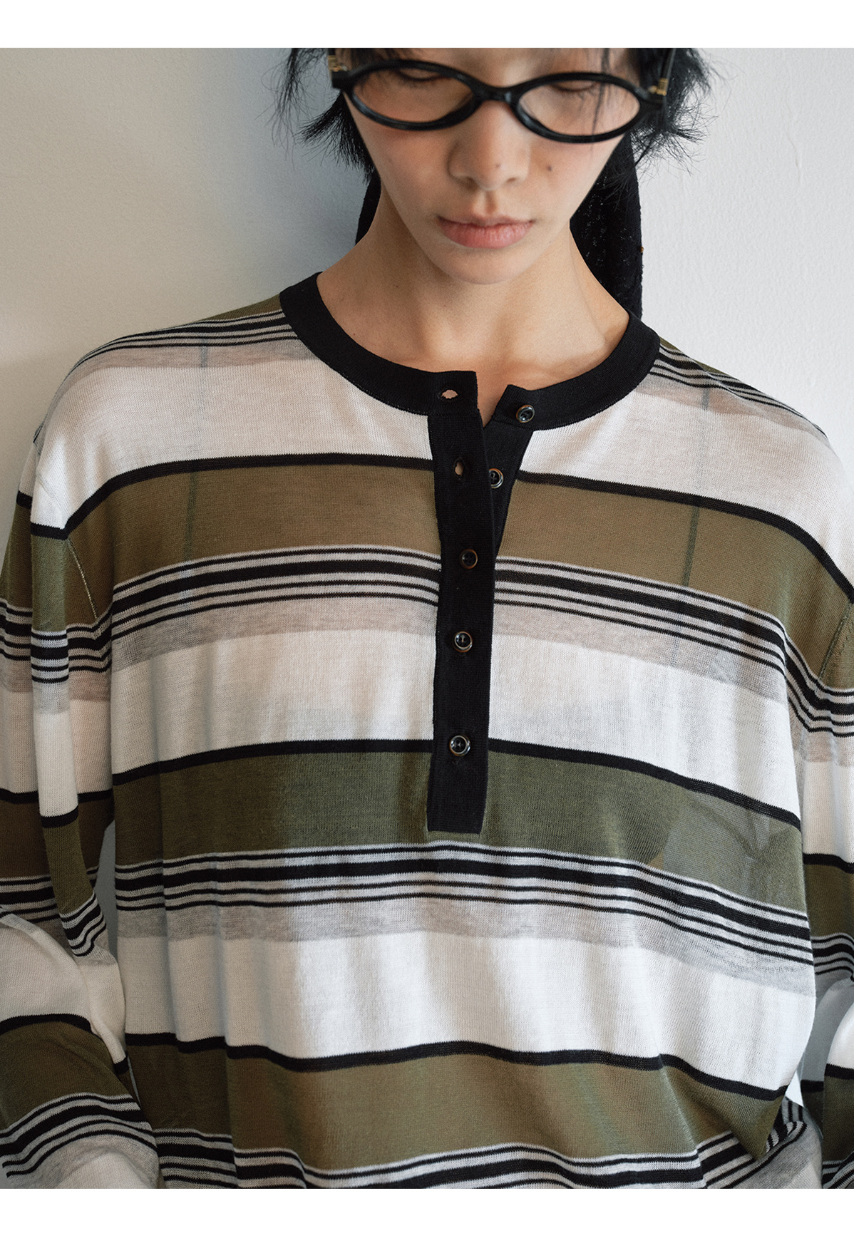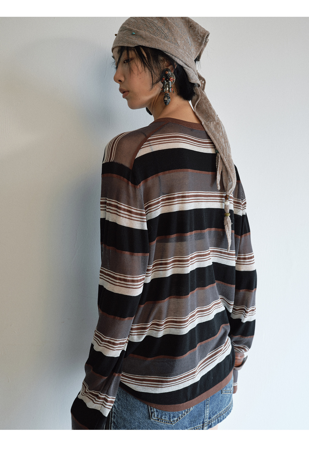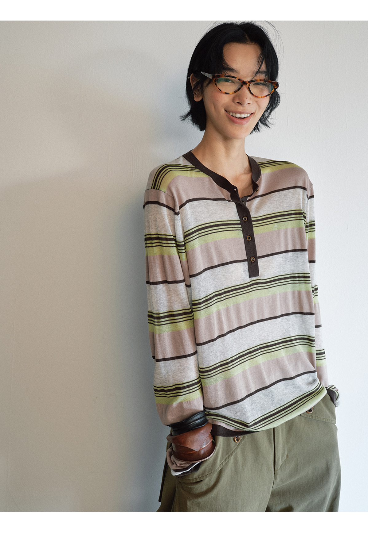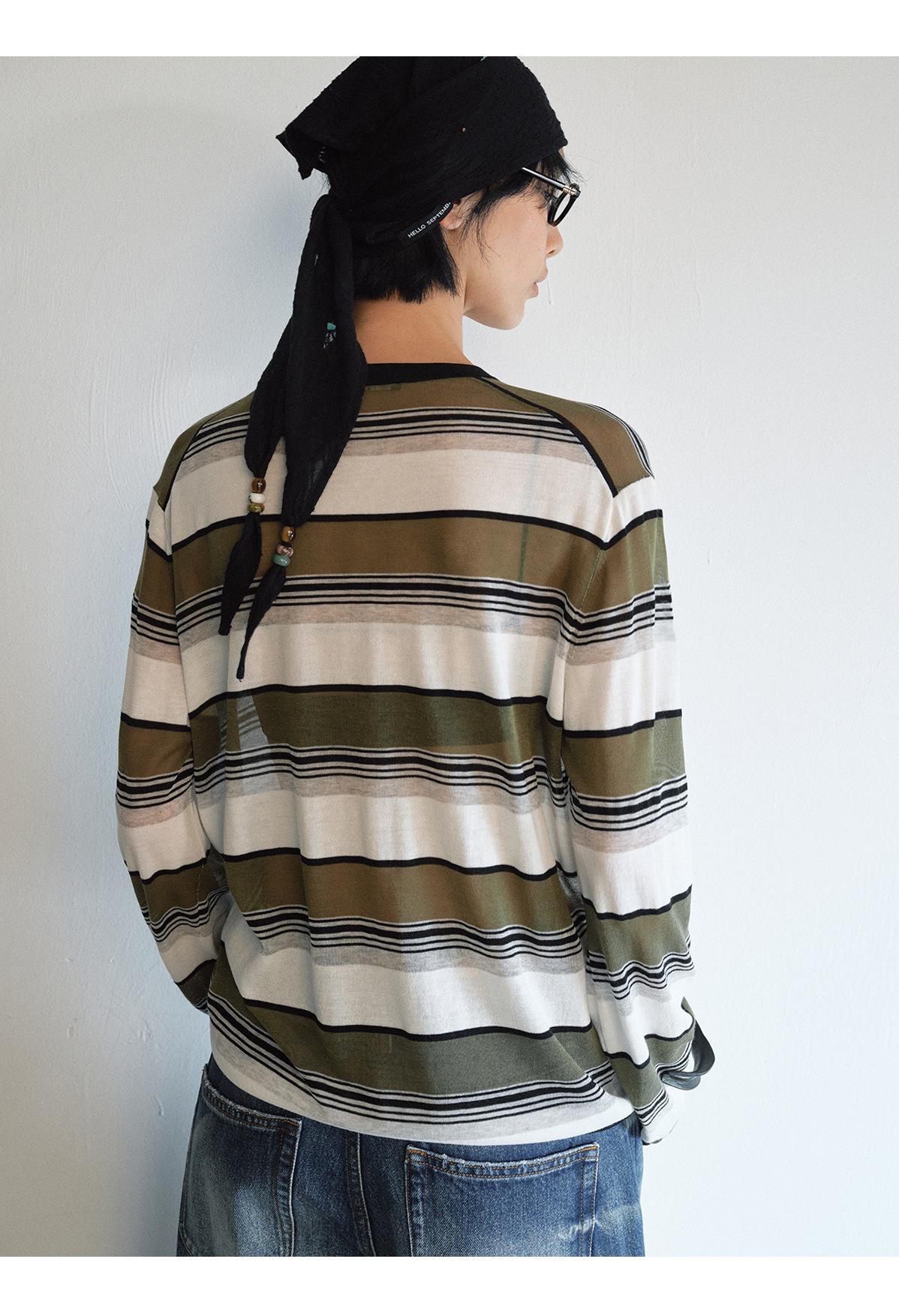 [시시] 초가을 신상 텐셀 레트로 스트라이프 니트 얇고 투명한 긴팔 헨리넥 탑 여성용 V9264