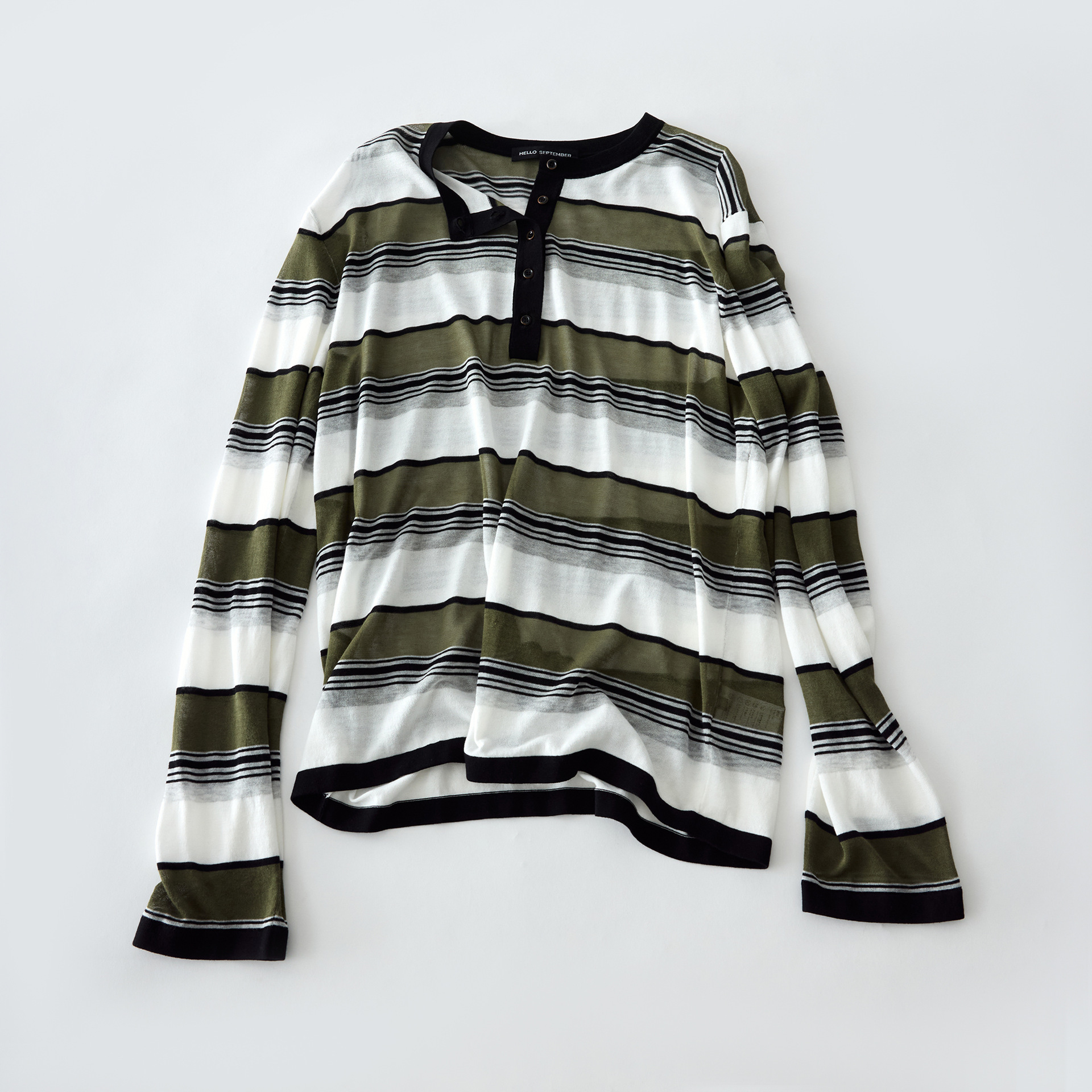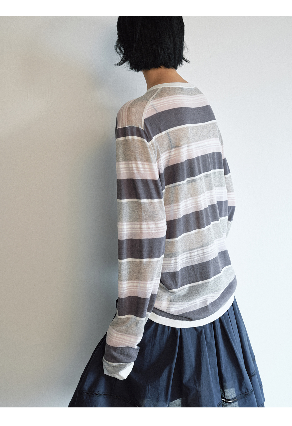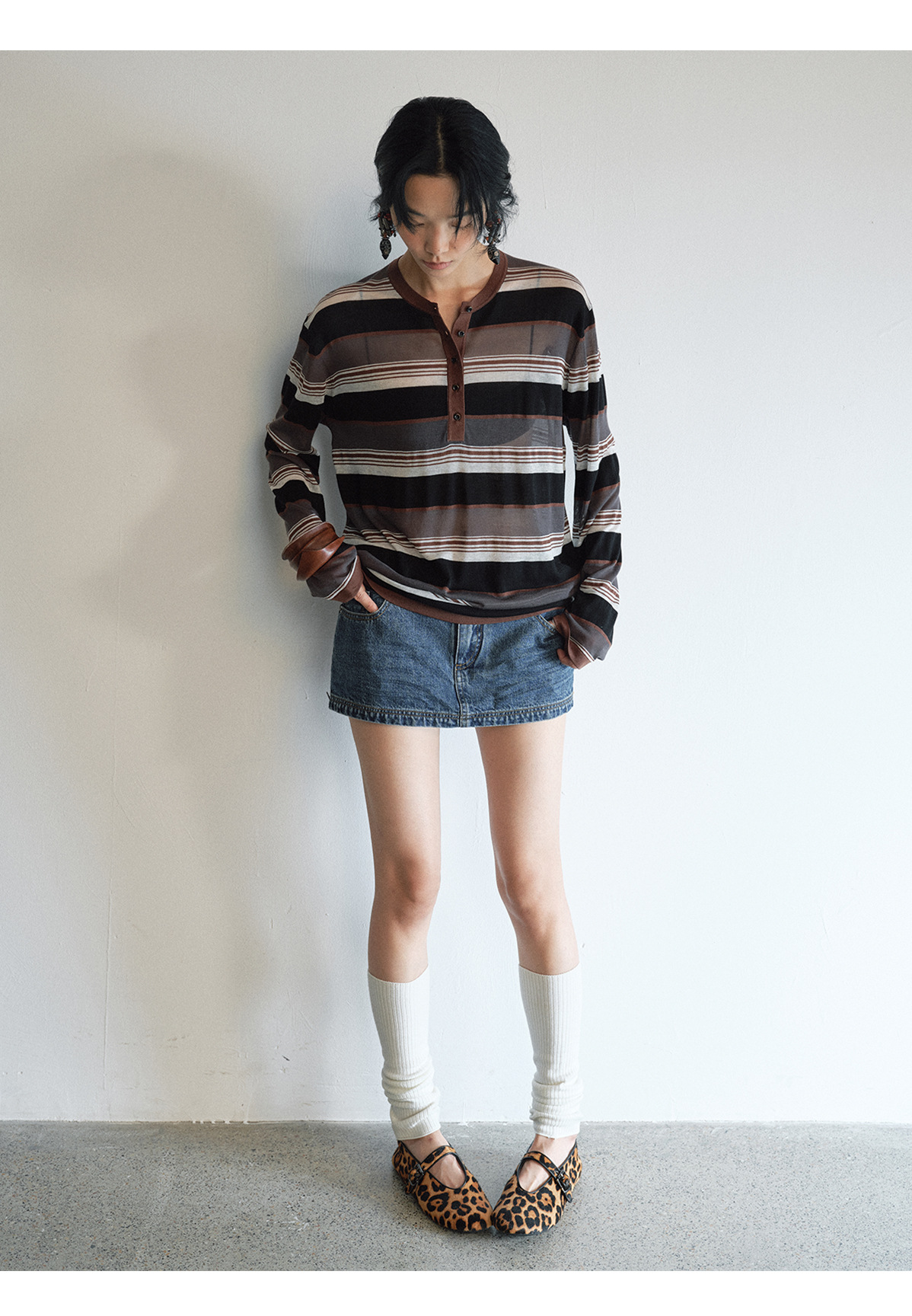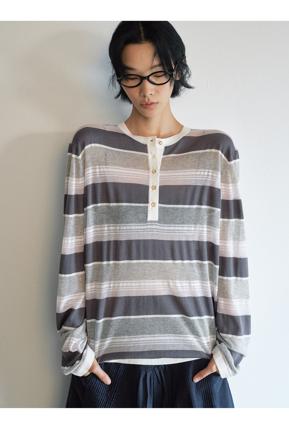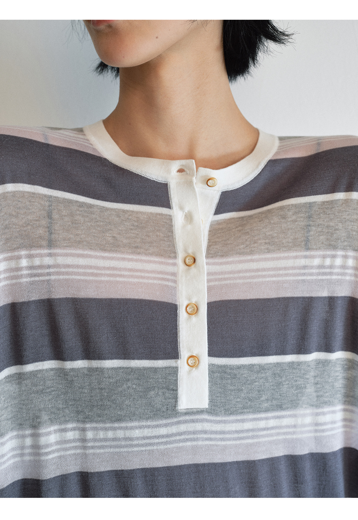 [시시] 초가을 신상 텐셀 레트로 스트라이프 니트 얇고 투명한 긴팔 헨리넥 탑 여성용 V9264