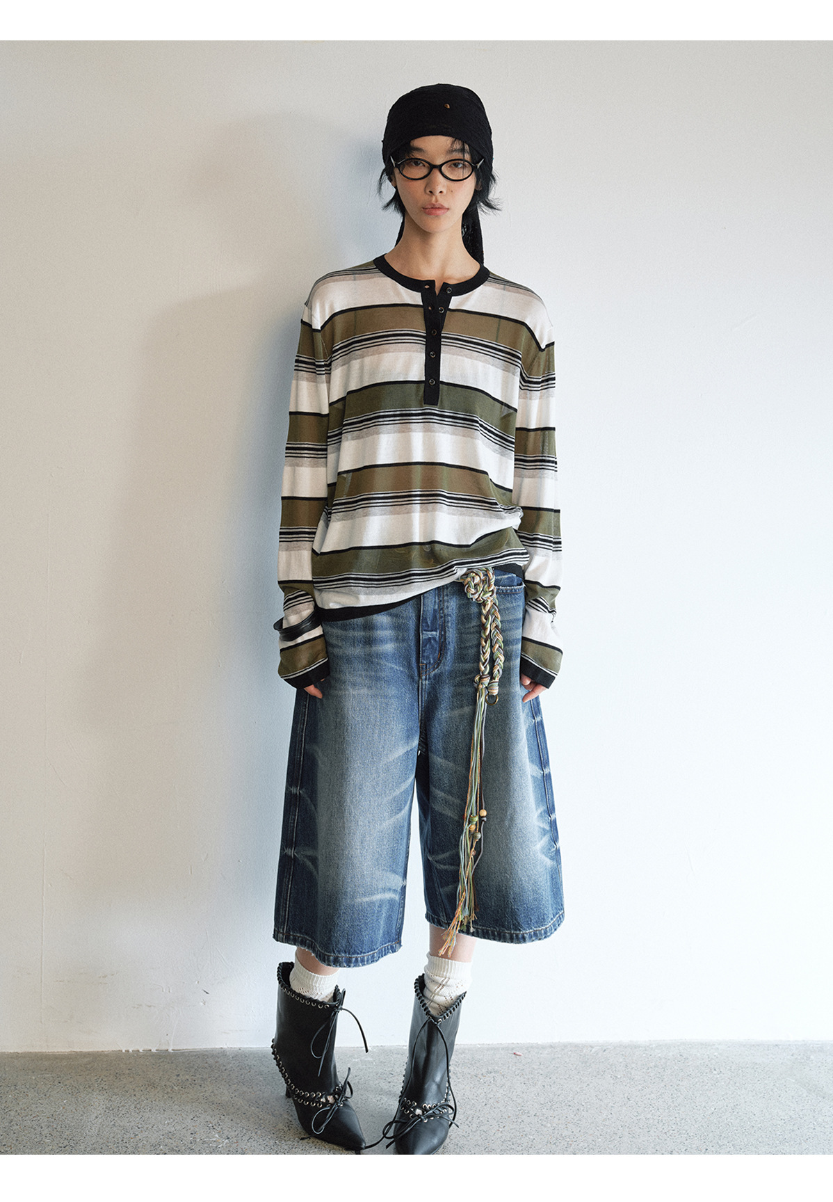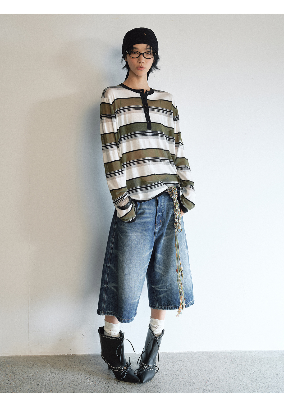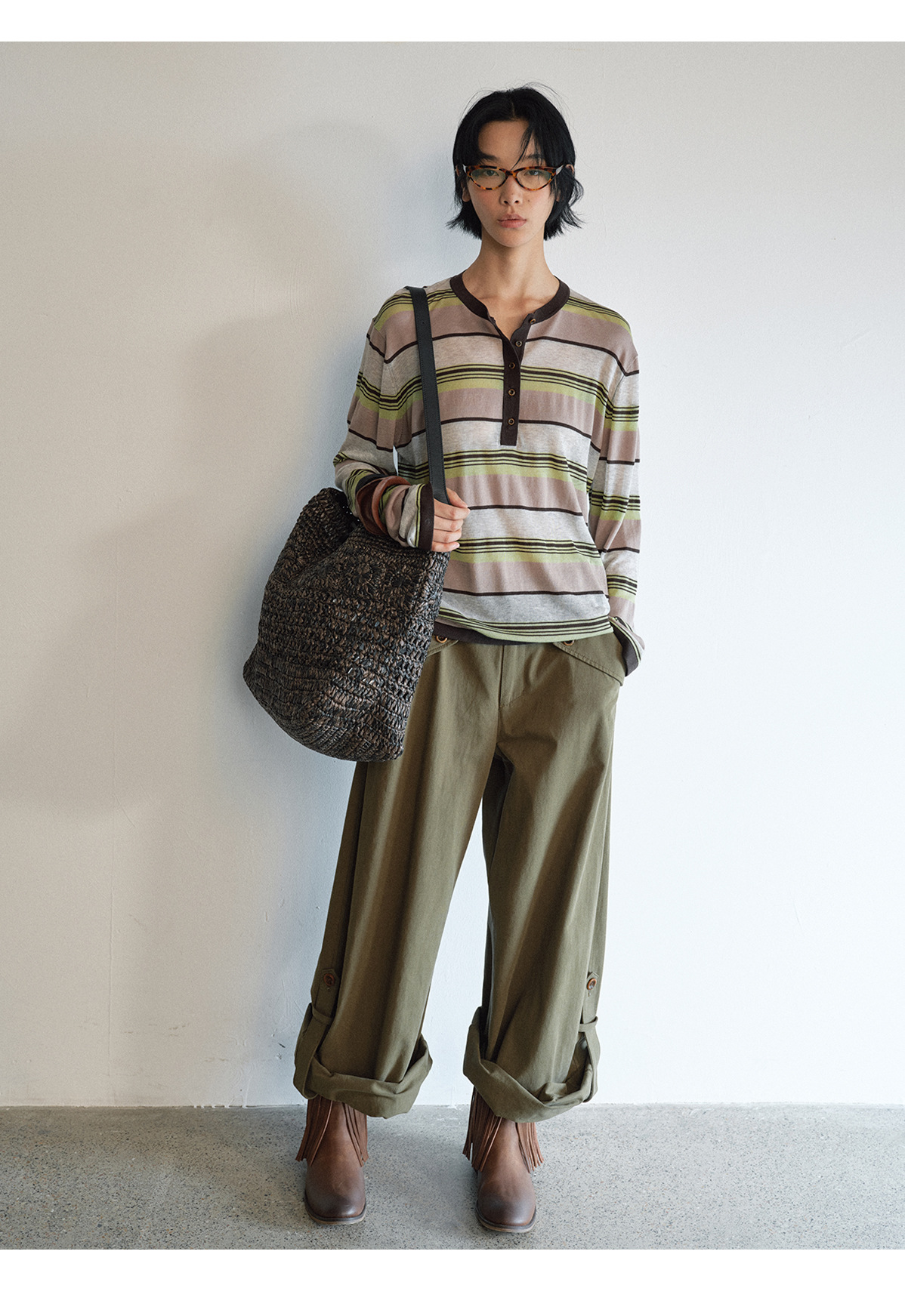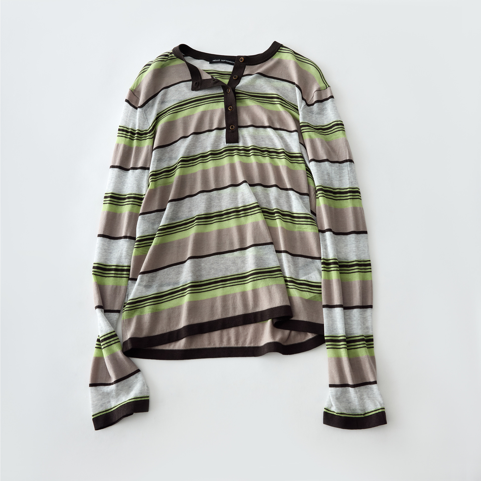 [시시] 초가을 신상 텐셀 레트로 스트라이프 니트 얇고 투명한 긴팔 헨리넥 탑 여성용 V9264