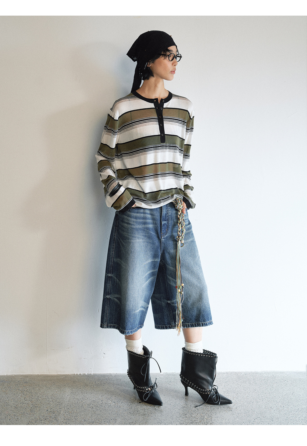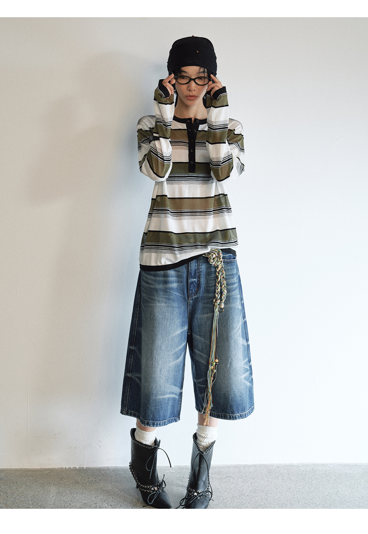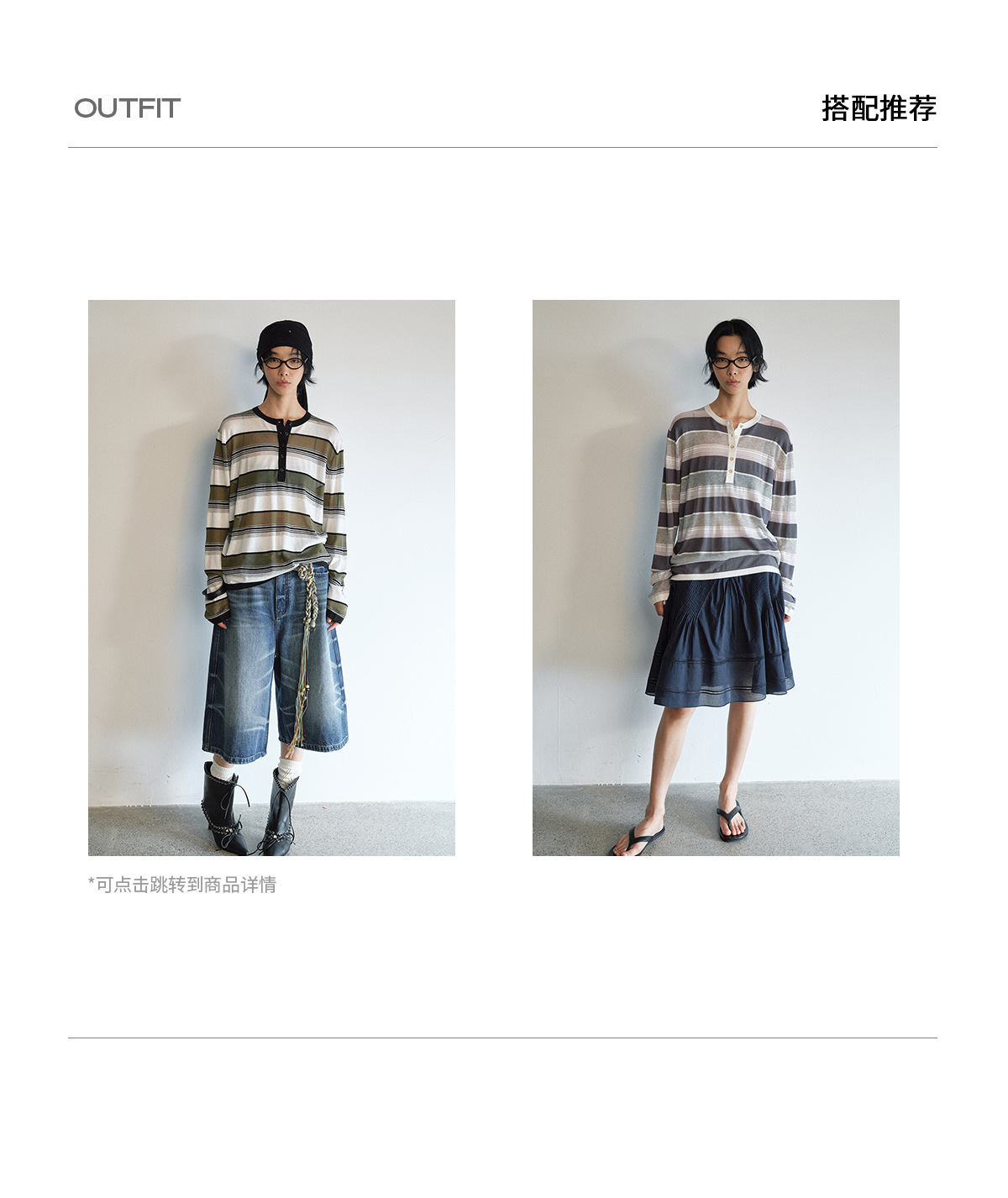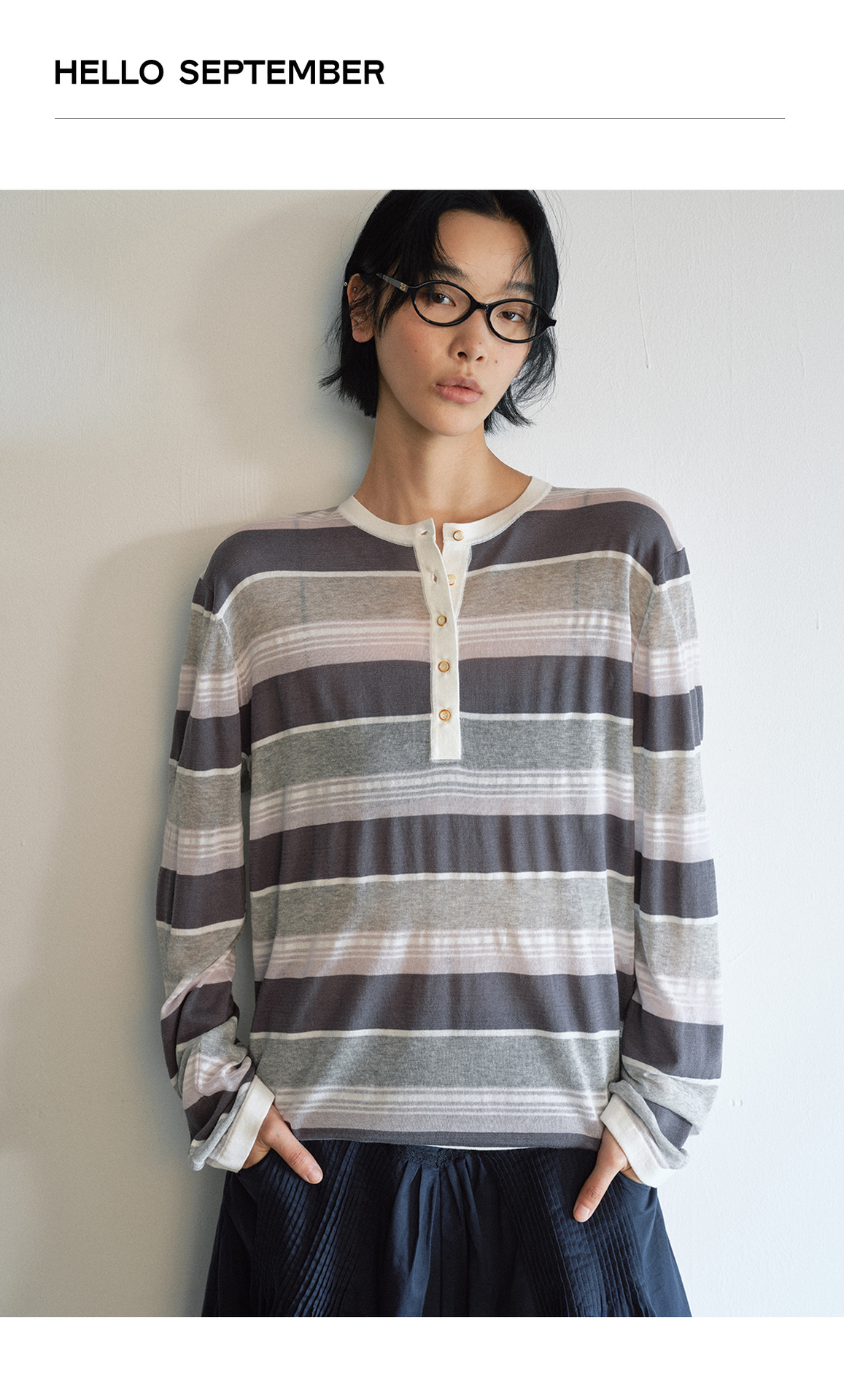 [시시] 초가을 신상 텐셀 레트로 스트라이프 니트 얇고 투명한 긴팔 헨리넥 탑 여성용 V9264스토어 가기
