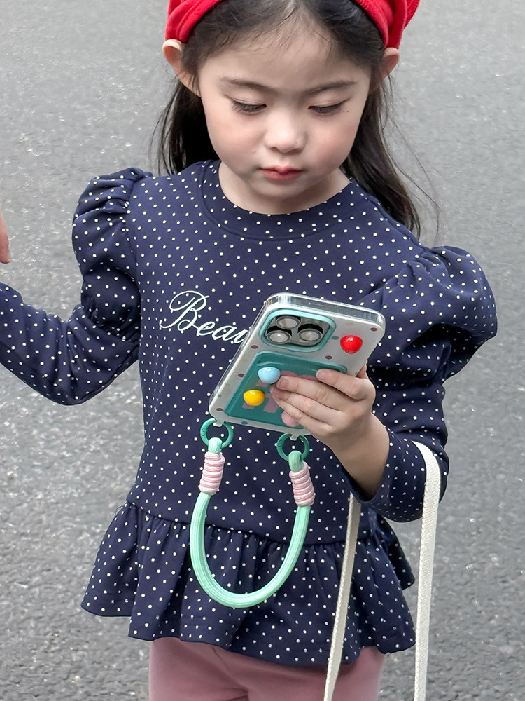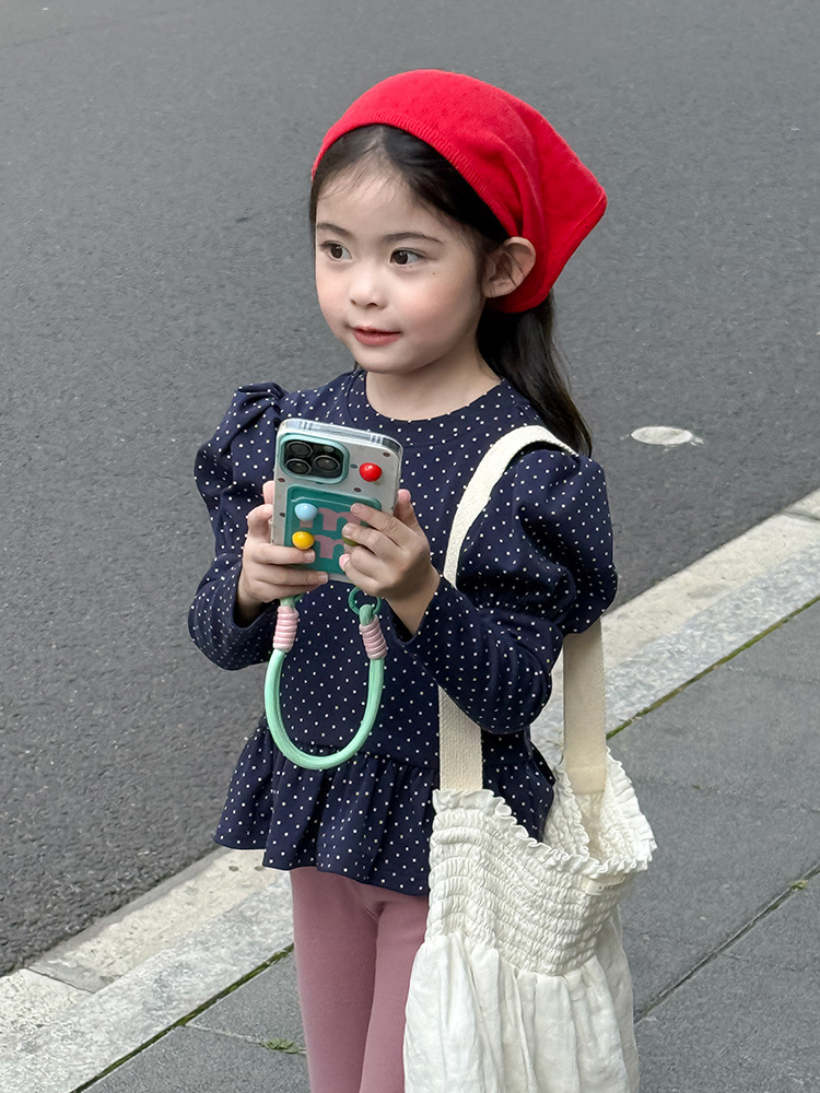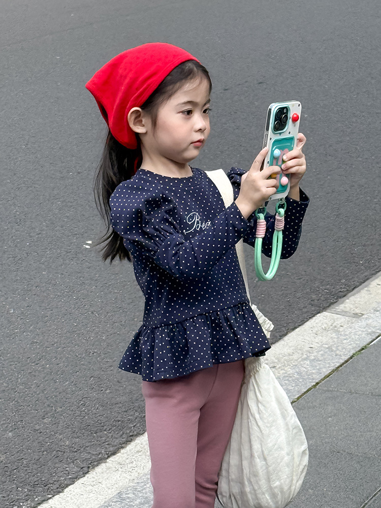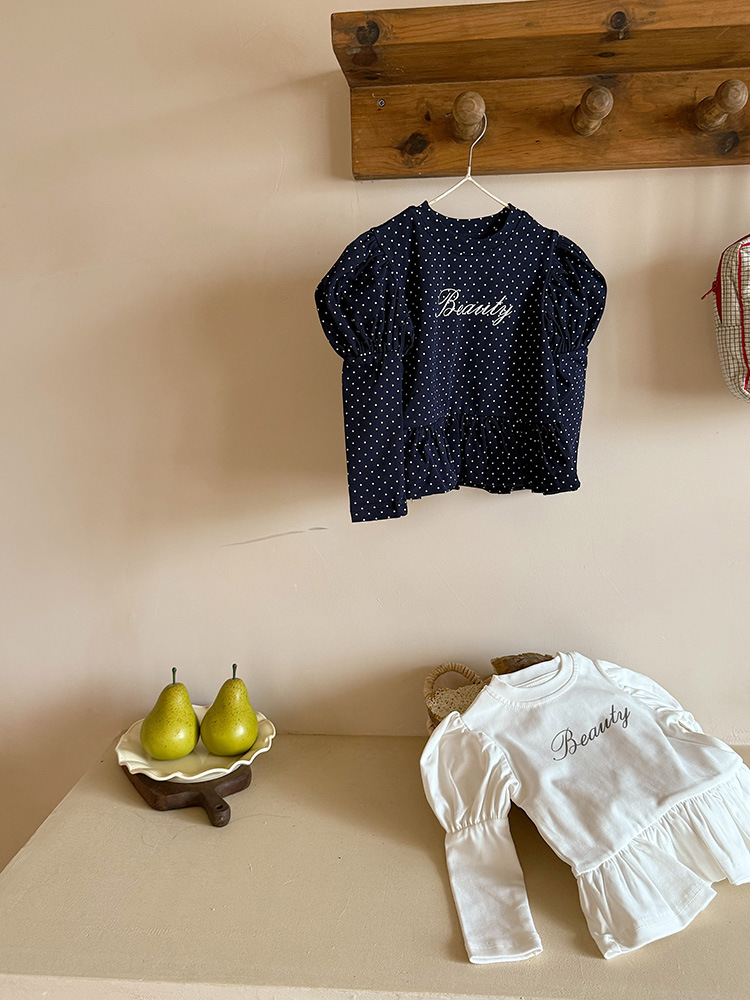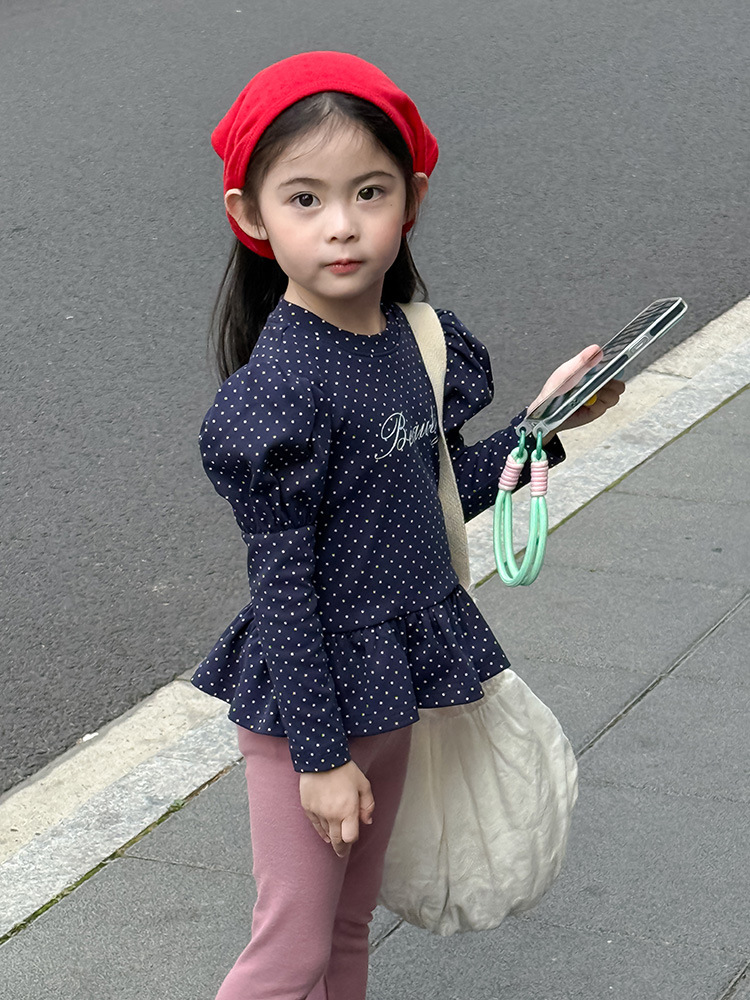 여아 퍼프 슬리브 셔츠 아동용 레터 스트레치 폴카 도트 긴팔 라운드 넥 티셔츠 가을 새로운 한국어 버전스토어 가기