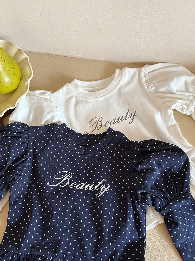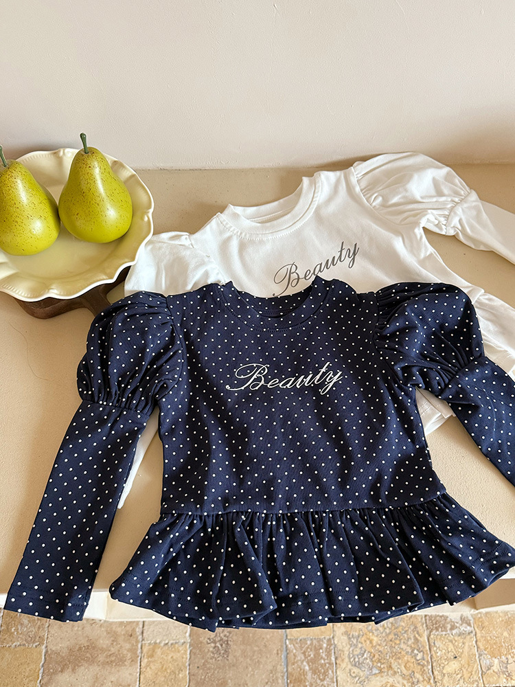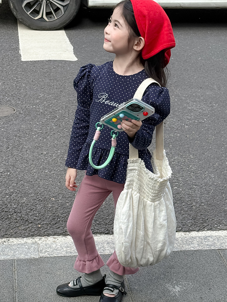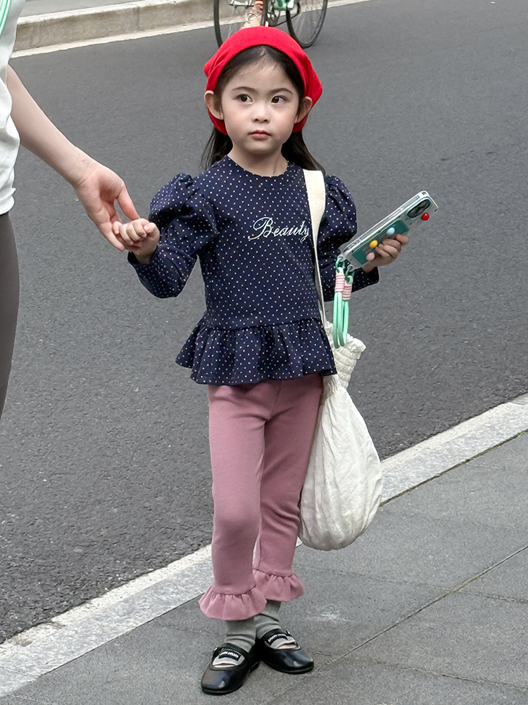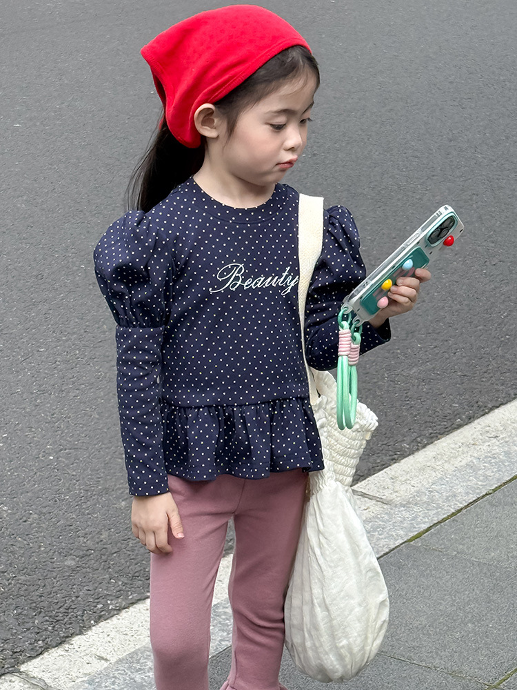 여아 퍼프 슬리브 셔츠 아동용 레터 스트레치 폴카 도트 긴팔 라운드 넥 티셔츠 가을 새로운 한국어 버전