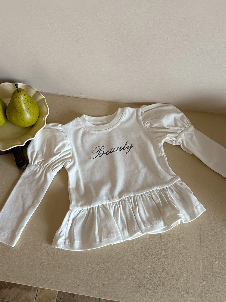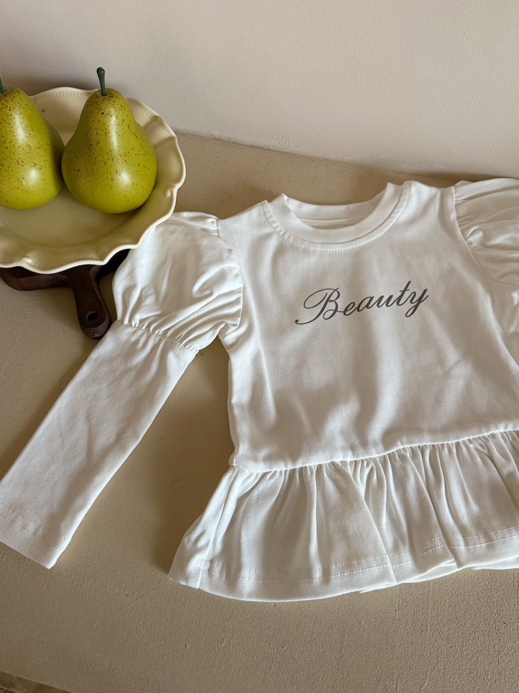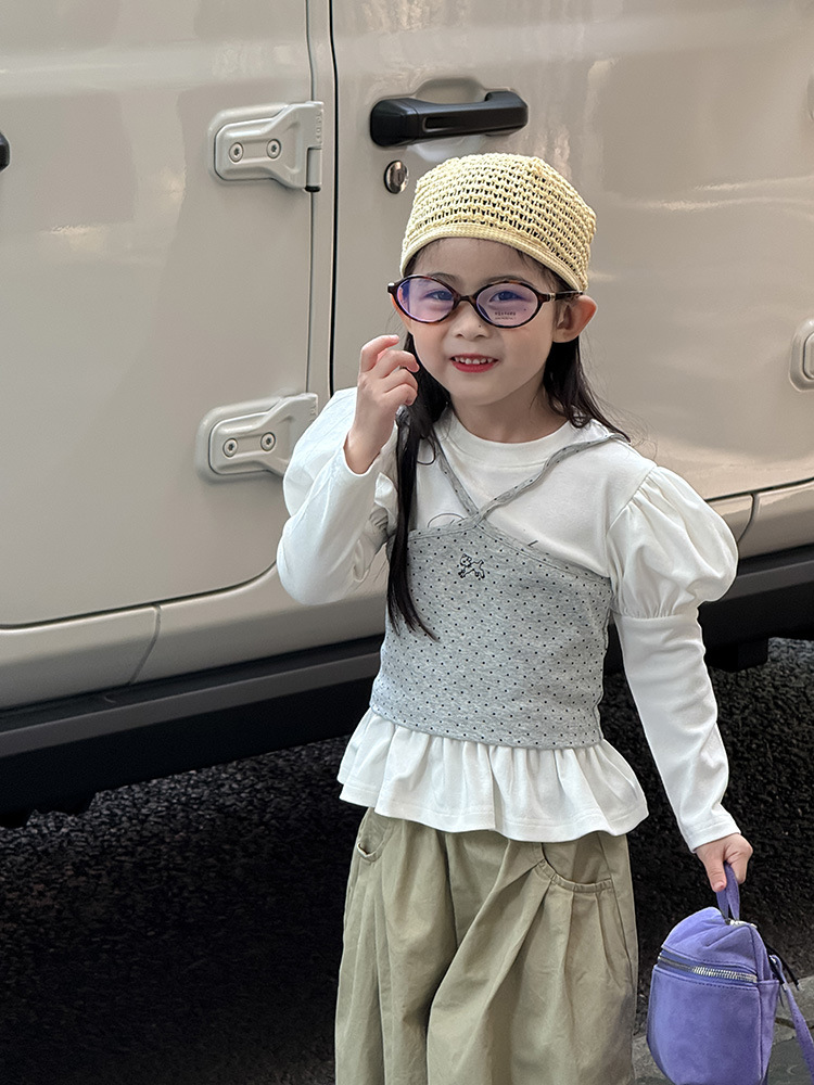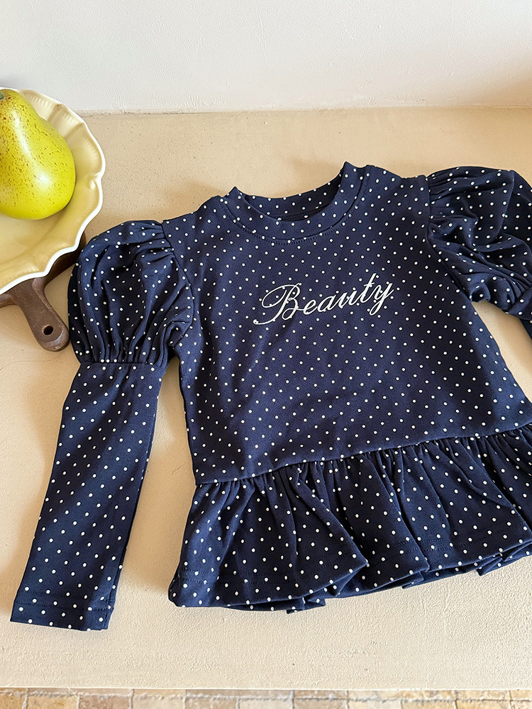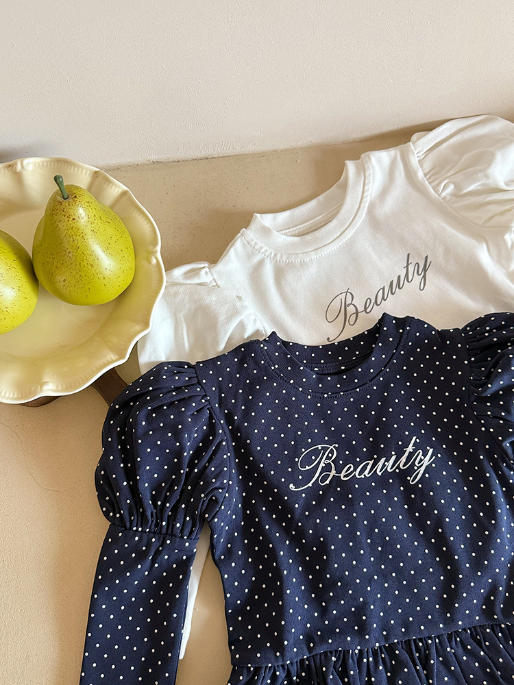 여아 퍼프 슬리브 셔츠 아동용 레터 스트레치 폴카 도트 긴팔 라운드 넥 티셔츠 가을 새로운 한국어 버전