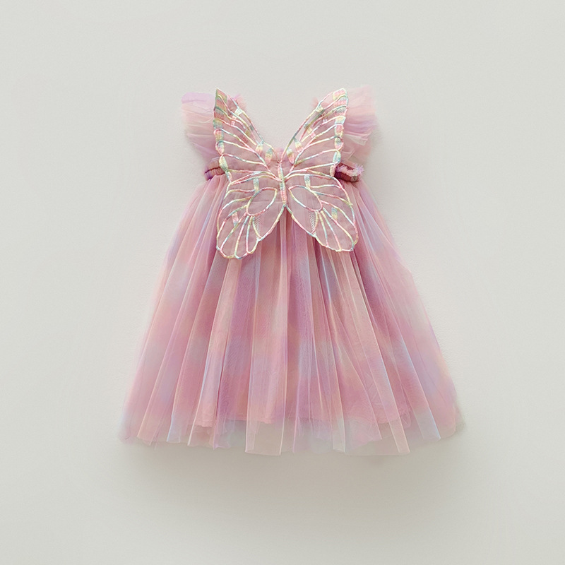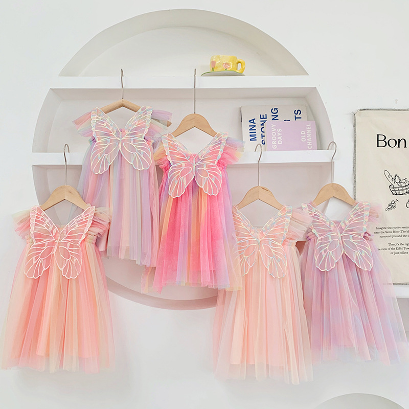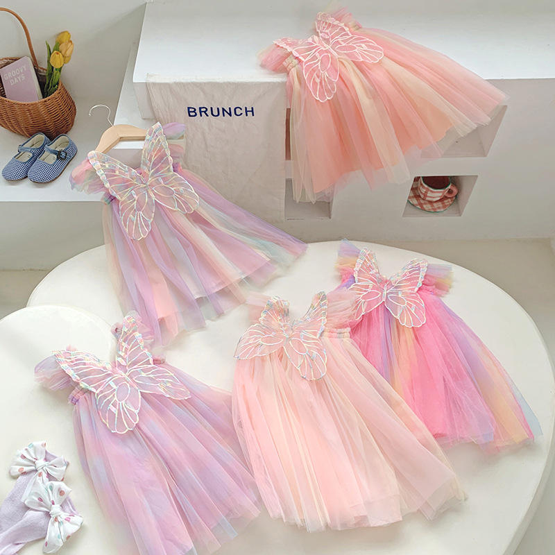 국경 간 아마존 무지개 날개 메쉬 소녀 드레스 2025 여름 플라잉 슬리브 아기 공주 드레스 투투 스커트