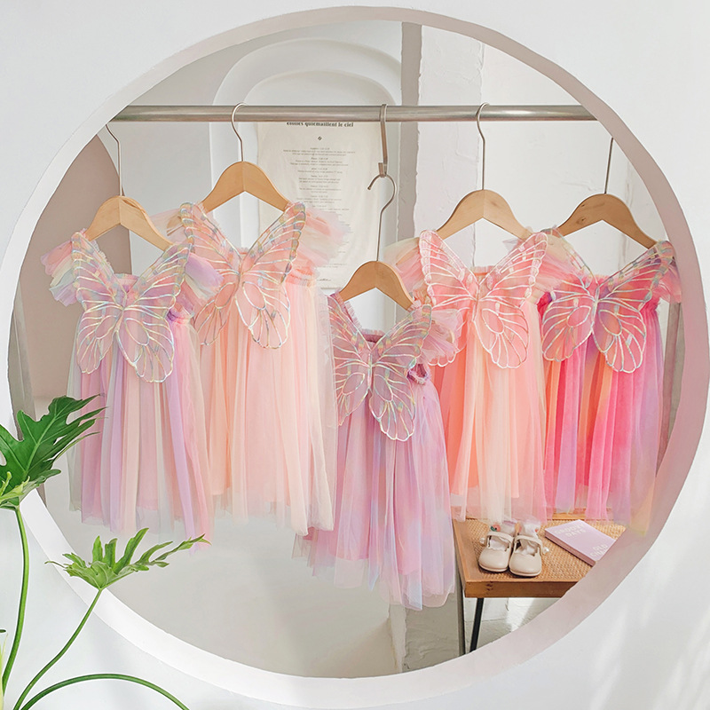 국경 간 아마존 무지개 날개 메쉬 소녀 드레스 2025 여름 플라잉 슬리브 아기 공주 드레스 투투 스커트스토어 가기