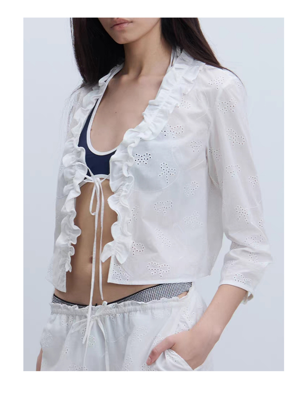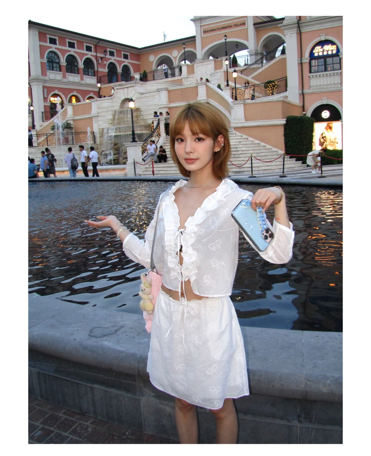 "오리지널 패브릭" Nanyou 여성 도매 버진 레이스 업 카디건 탑 보우 자수 스커트 슈트