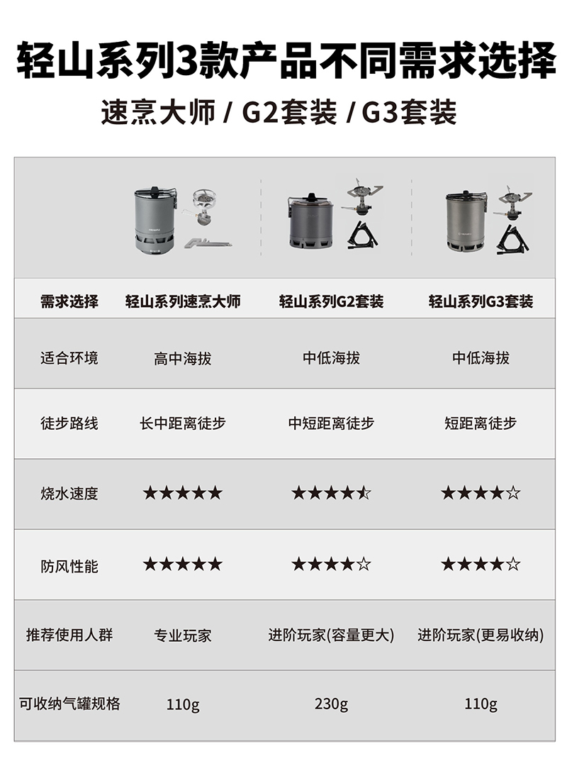 • Qingshan 시리즈 하이킹 세트(G2 냄비는 230G 가스 탱크를 담을 수 있음)