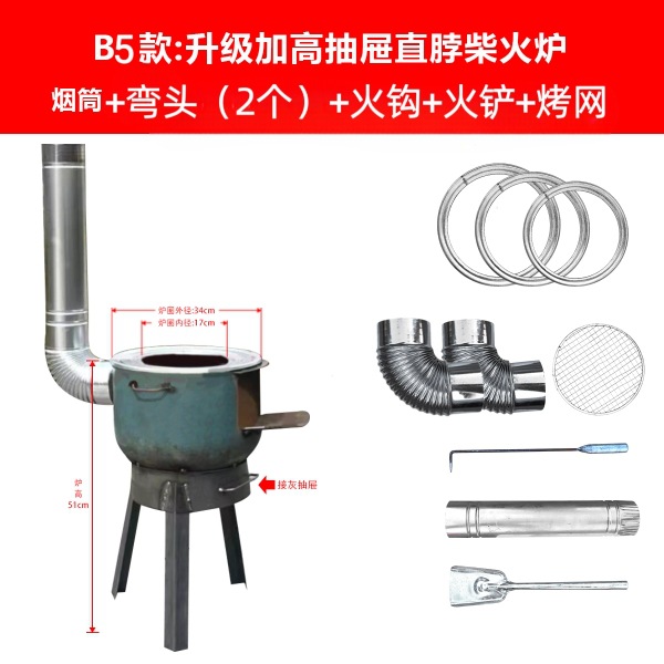 • 모델 B5: 서랍이 있는 높은 직선 목 장작 난로 + 가장자리가 있는 미끄럼 방지 난로 링(3개) + 팔꿈치(2개) + 굴뚝 + 화재 후크 + 화재 삽 + 바베큐 그물