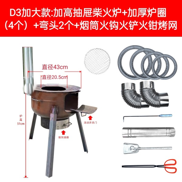 • D3 플러스 사이즈: 두꺼워지고 높아진 서랍 장작 난로 + 두꺼워진 난로 링(4개) + 팔꿈치(2개) + 굴뚝 + 화재 후크 + 화재 삽 + 화재 집게 + 바베큐 그물