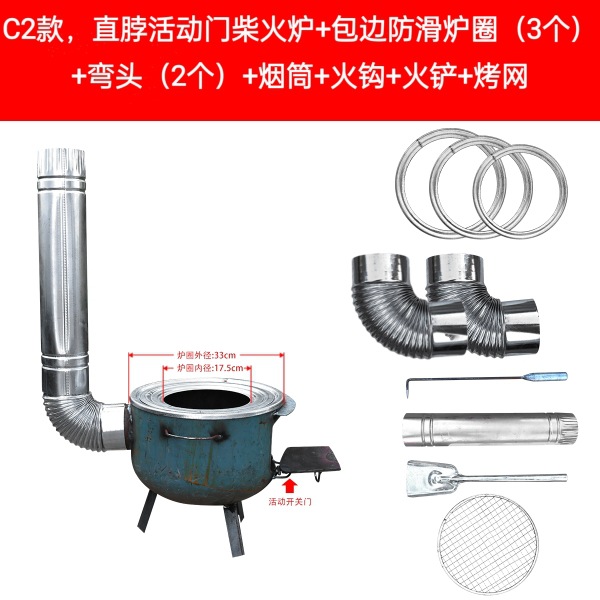 • C2 모델: 스트레이트 넥 이동식 도어 장작 난로 + 모서리가 있는 미끄럼 방지 난로 링(3개) + 팔꿈치(2개) + 굴뚝 + 화재 후크 + 화재 삽 + 바베큐 그물