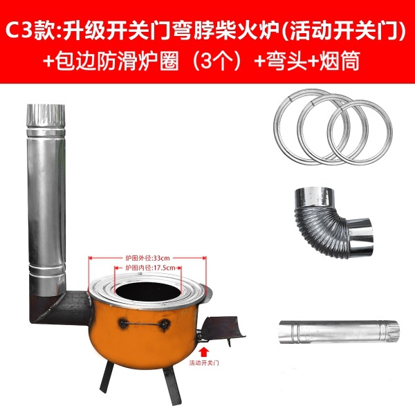 • C3 모델: 곡선형 목 이동식 도어 장작 난로 + 가장자리 미끄럼 방지 난로 링(3개) + 팔꿈치 + 굴뚝