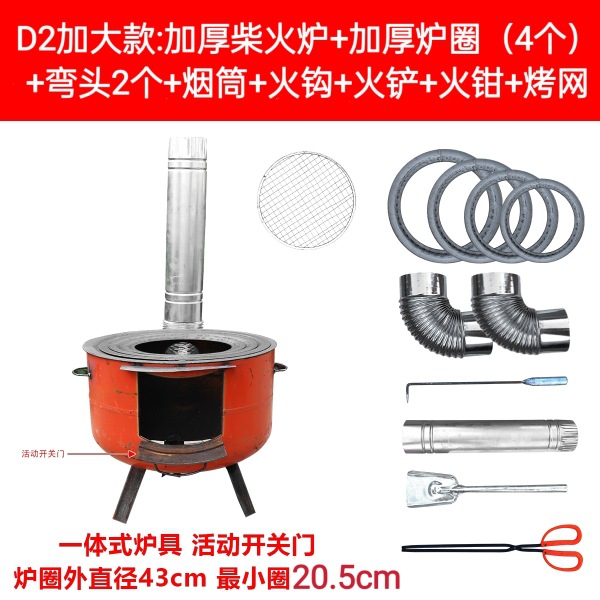 • D2 확대 모델: 두꺼운 장작 난로 + 두꺼운 난로 링(4개) + 팔꿈치(2개) + 굴뚝 + 화재 후크 + 화재 삽 + 화재 펜치 + 바베큐 그물