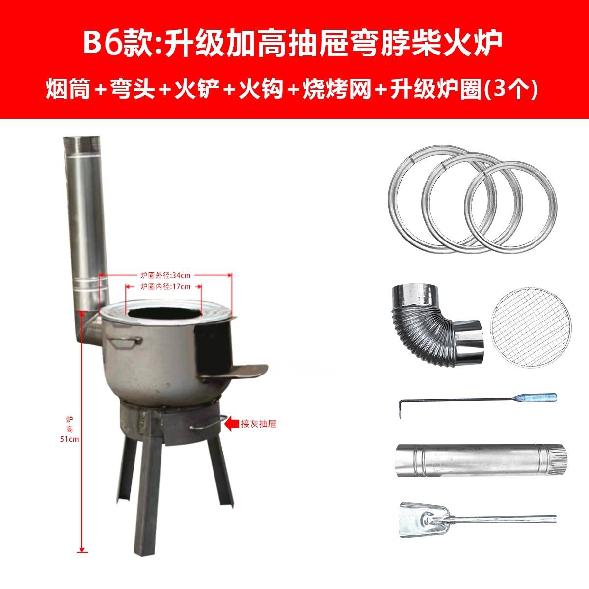 • 모델 B6: 서랍이 있는 곡선형 목재 스토브 + 가장자리가 있는 미끄럼 방지 스토브 링(3개) + 팔꿈치 + 굴뚝 + 화재 후크 + 화재 삽 + 바베큐 그물