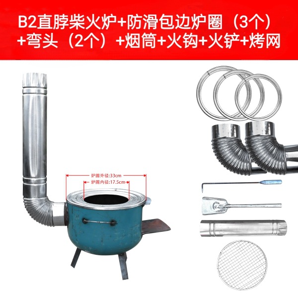 • 모델 B2: 스트레이트 넥 장작 난로 + 모서리가 있는 미끄럼 방지 난로 링(3개) + 팔꿈치(2개) + 굴뚝 + 화재 후크 + 화재 삽 + 바베큐 그물