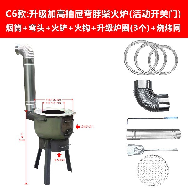 • C6 모델: 이동식 도어 서랍 곡선 목 장작 난로 + 가장자리 미끄럼 방지 난로 링(3개) + 팔꿈치 + 굴뚝 + 화재 후크 + 화재 삽 + 바베큐 그물