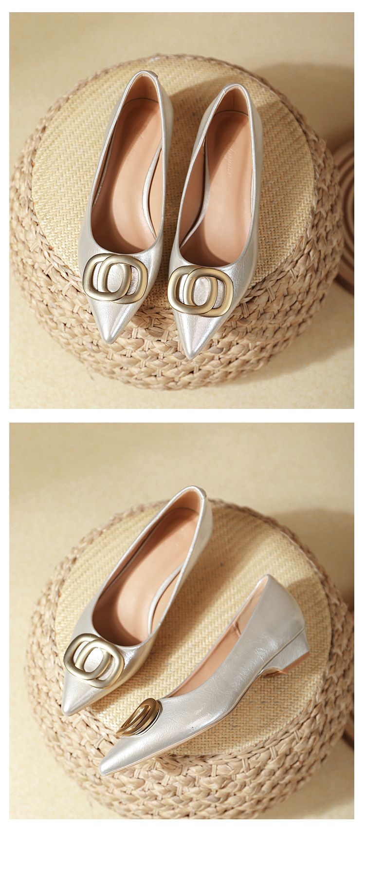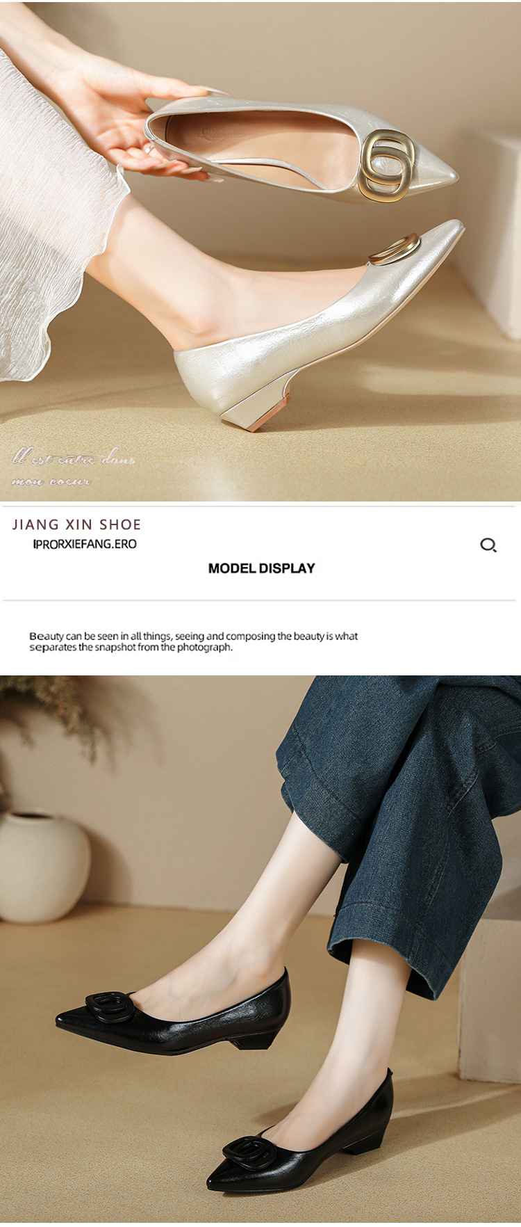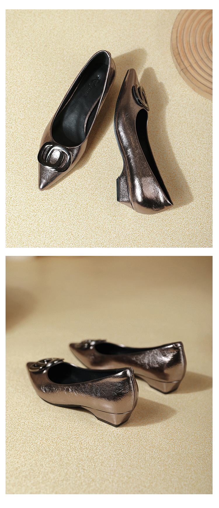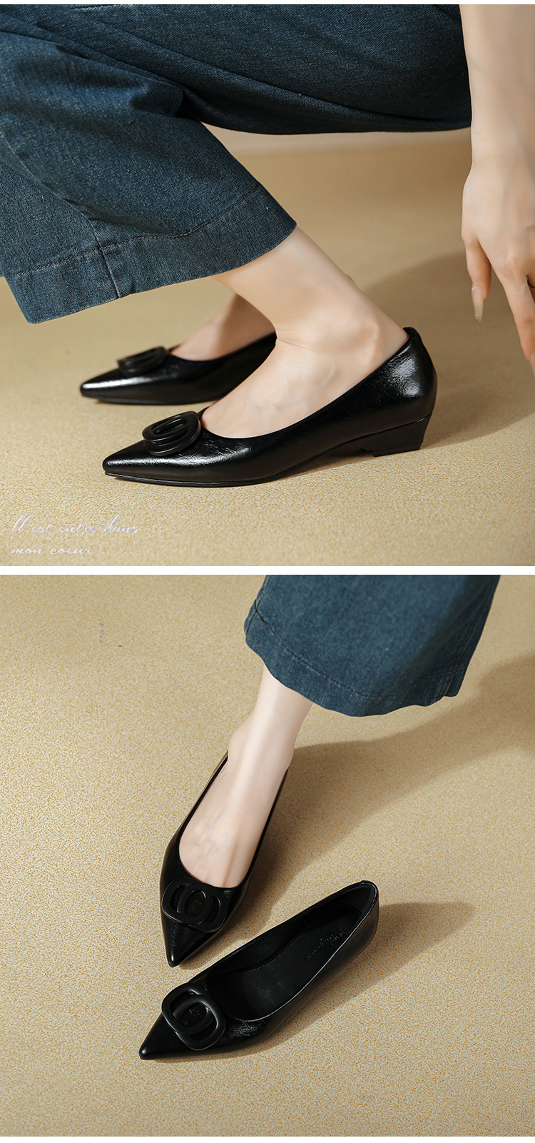 두꺼운 굽이 있는 여성용 뾰족한 구두 2025 봄 가을 신작 Huizhou 여성화 부드러운 가죽 작은 향기 스타일 편안한 낮은 굽 신발스토어 가기