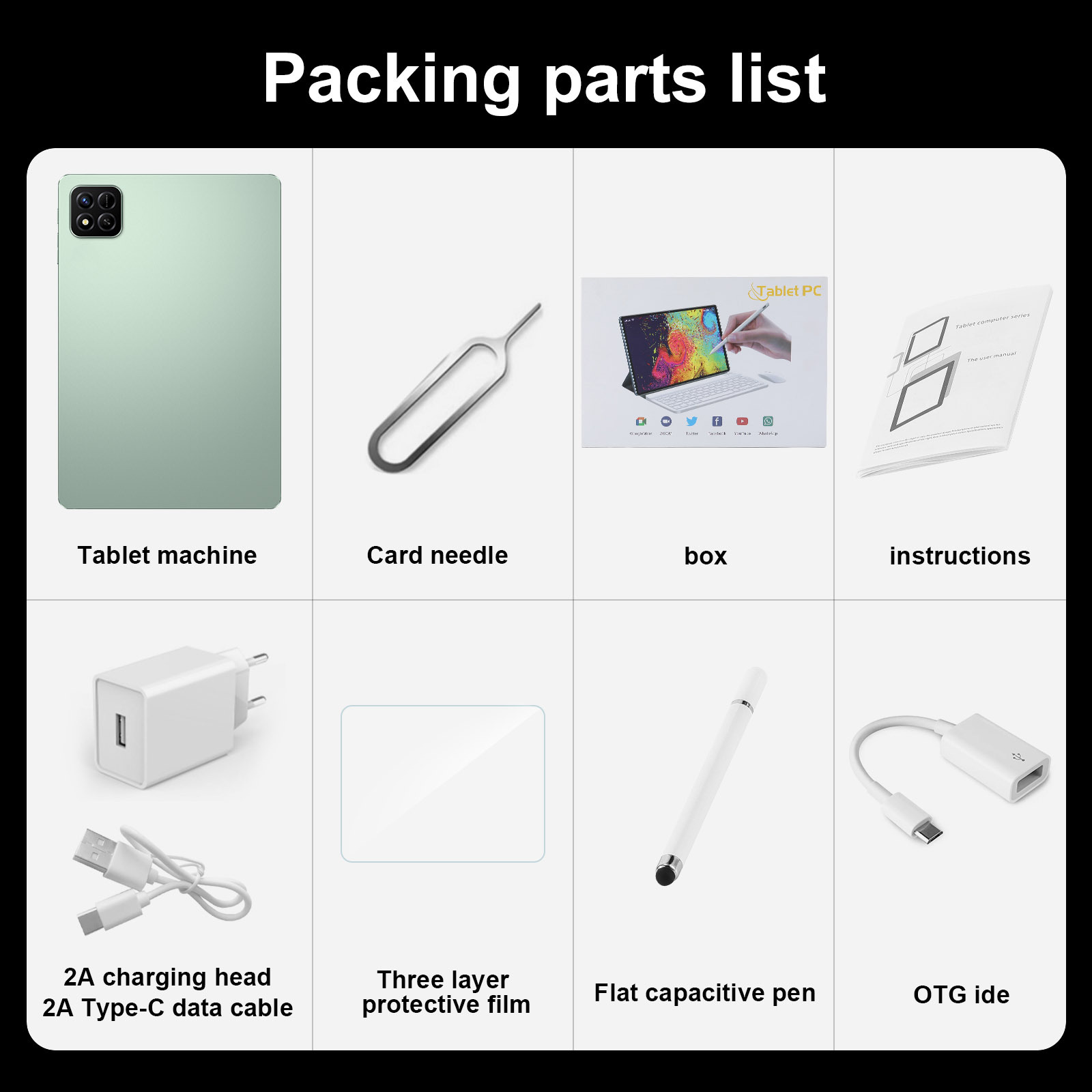 出货标准:平板+卡针+盒子+说明书+2A充头+Type-c数据线+三层保护膜+平板电容笔+OTG转接口