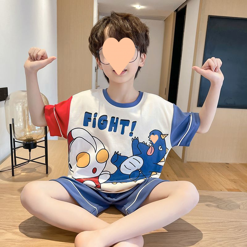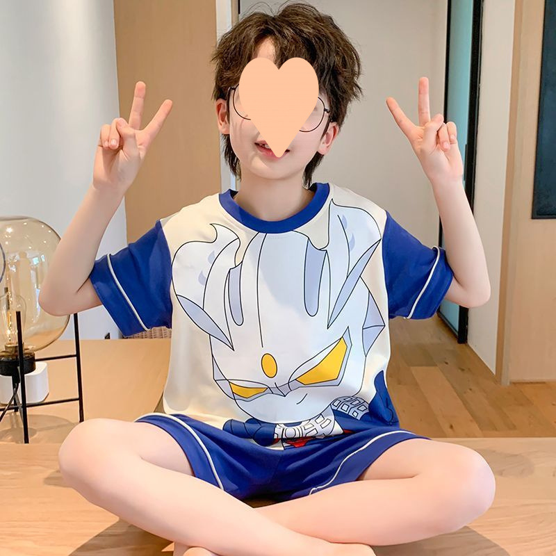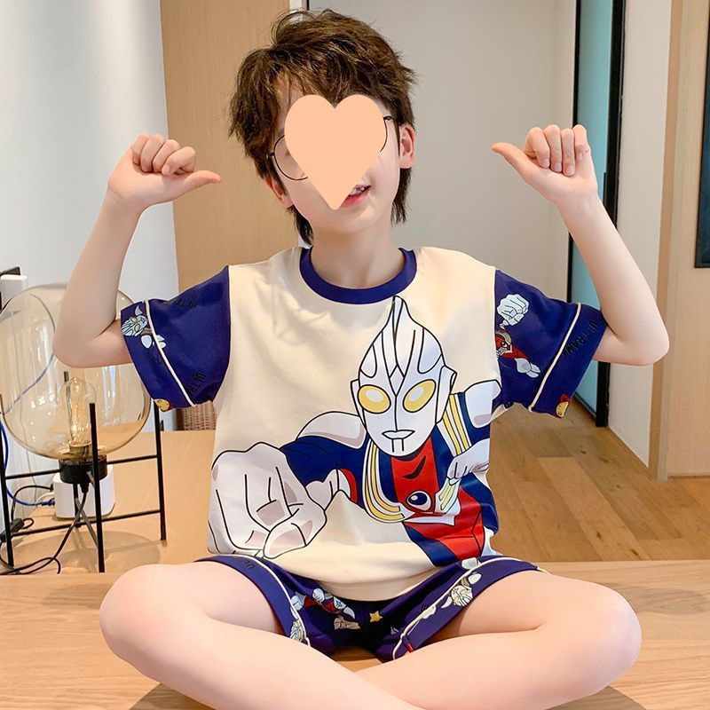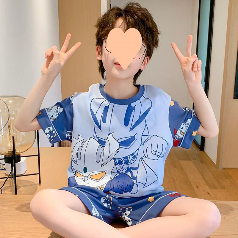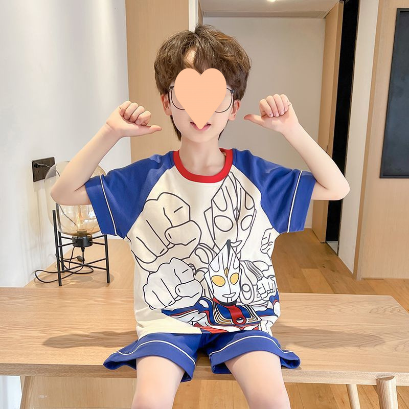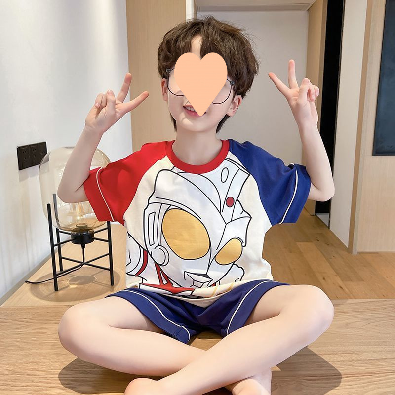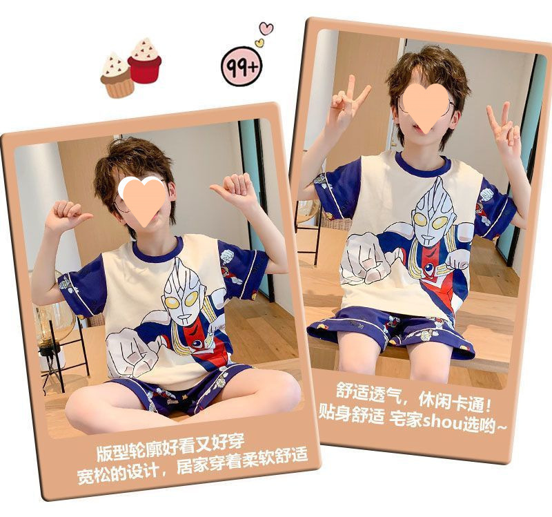 소년 잠옷 여름 순수 면화 반팔 얇은 소년 중대형 어린이 만화 울트라 맨 어린이 가정 의류 세트
