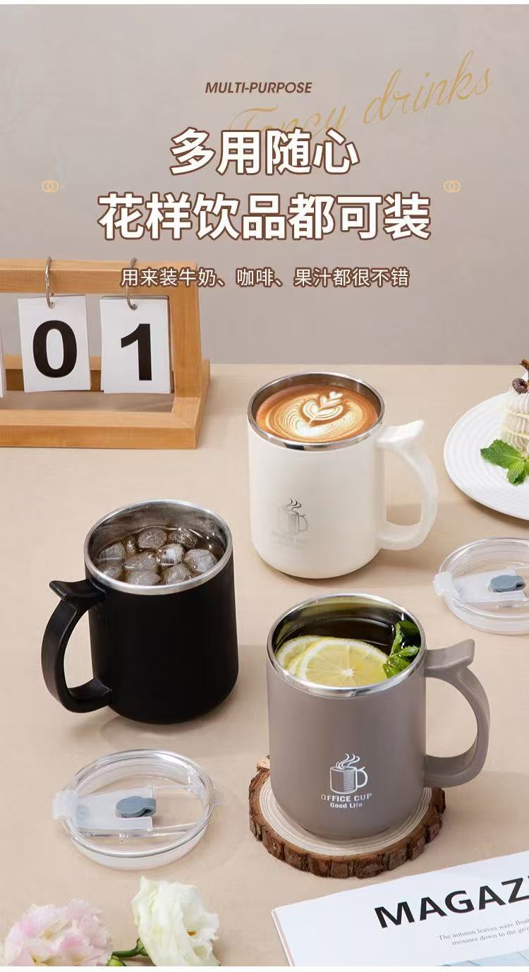 跨境外贸咖啡杯高颜值304马克杯防烫带盖家用水杯办公咖啡杯创意