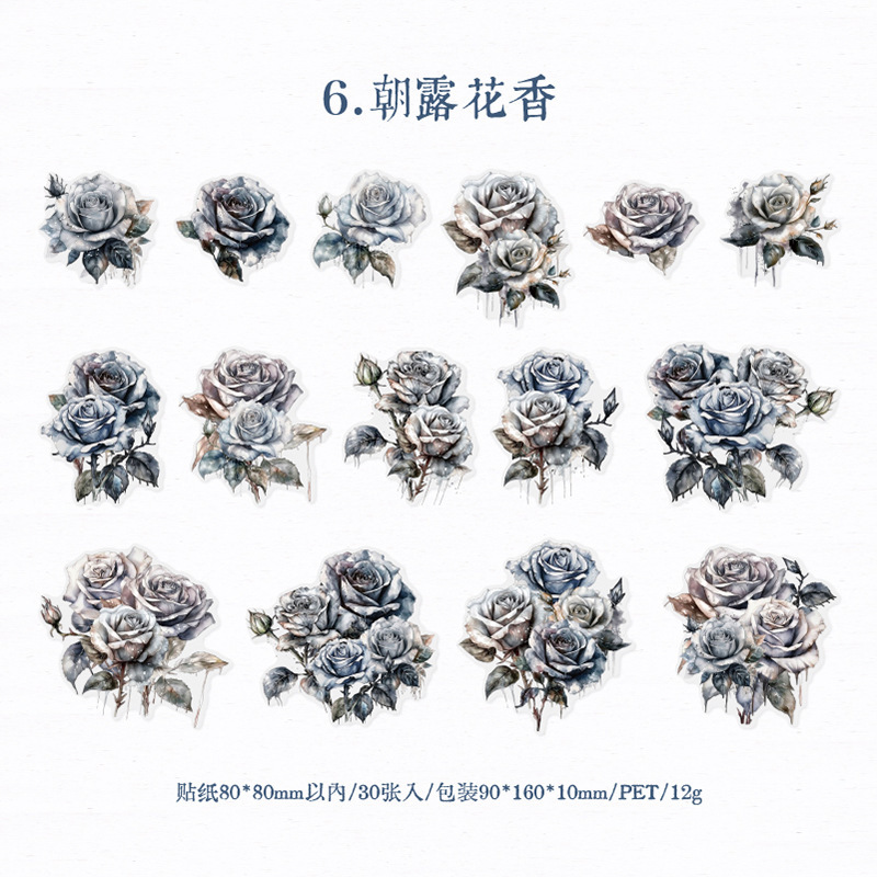 Yanji Rose의 모험 시리즈 PET 스티커 팩 복고풍 꽃 핸드북 장식 재료 30장 6가지 스타일