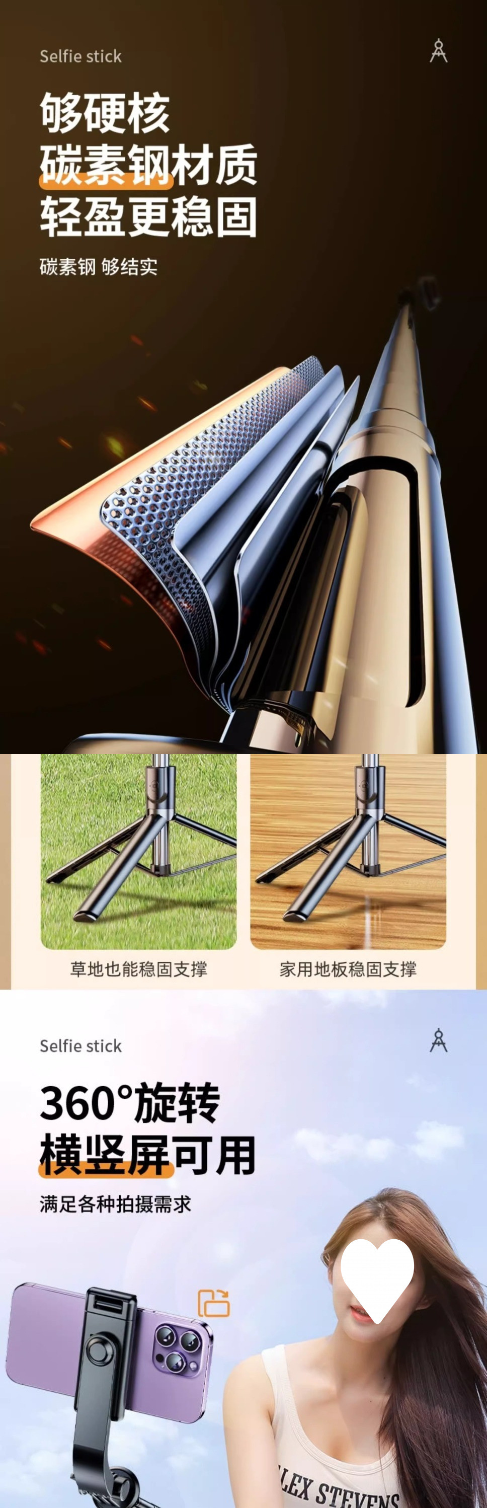• [다크나이트 블랙] 일체형 폴딩-[ 1.7m 확장 버전] 가로 및 세로 촬영 + 블루투스 리모컨 + 강화된 손떨림 방지