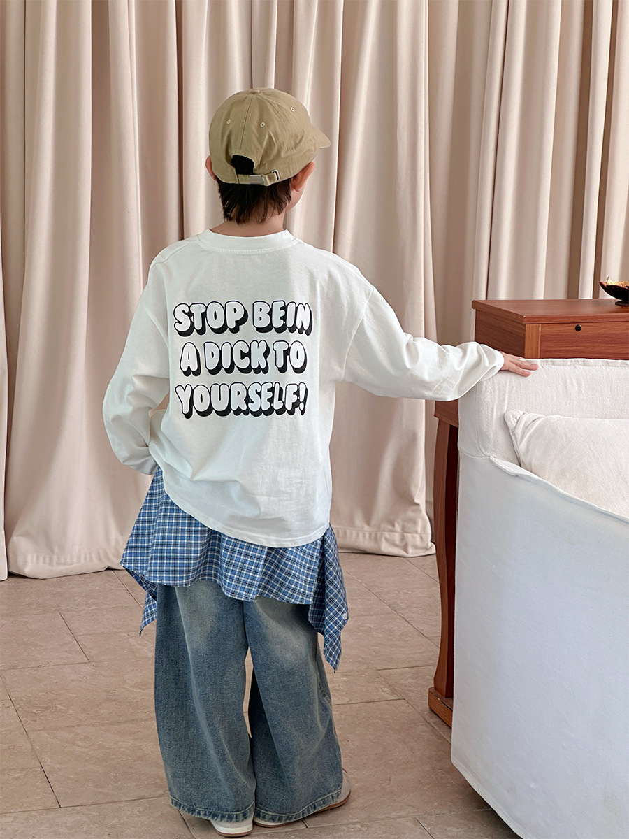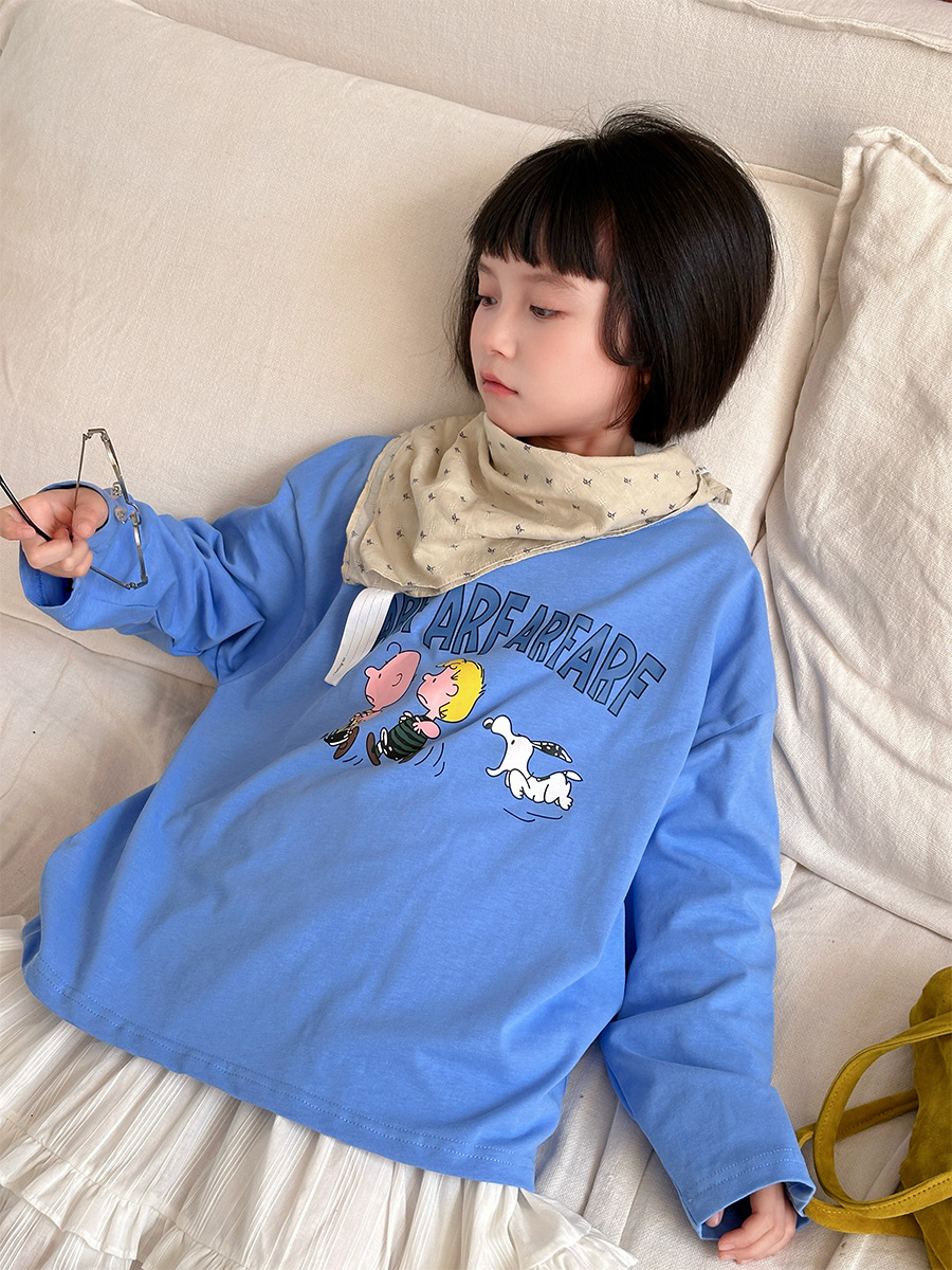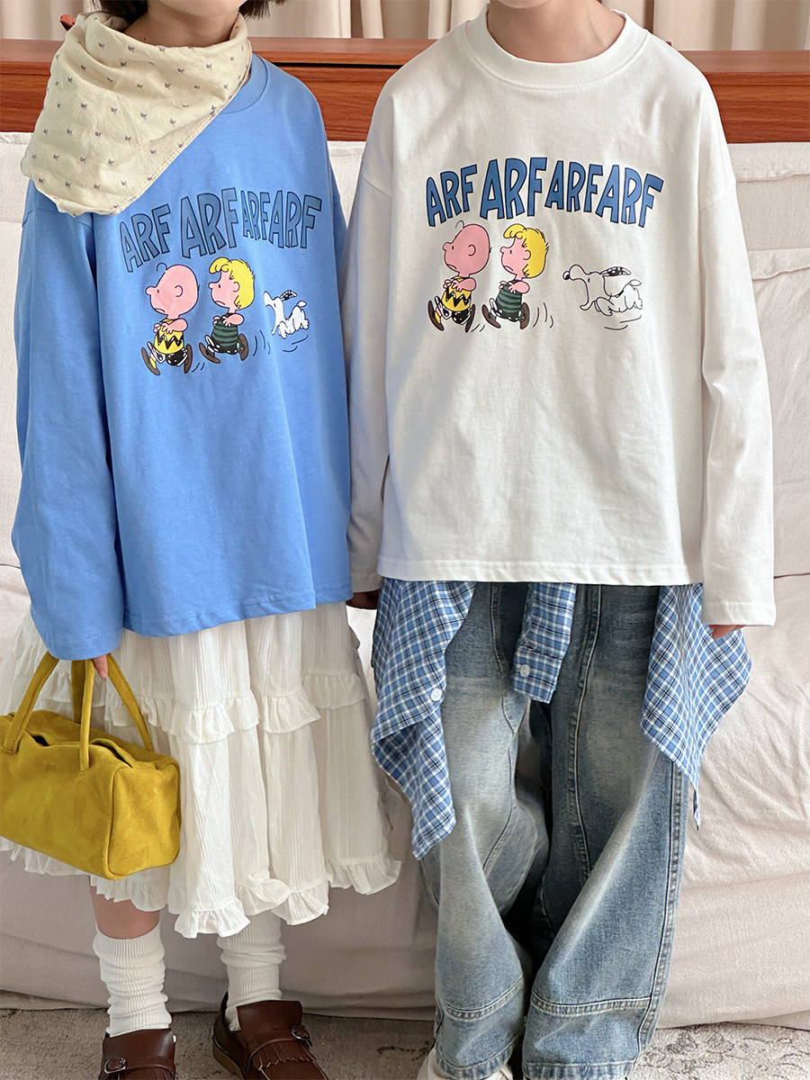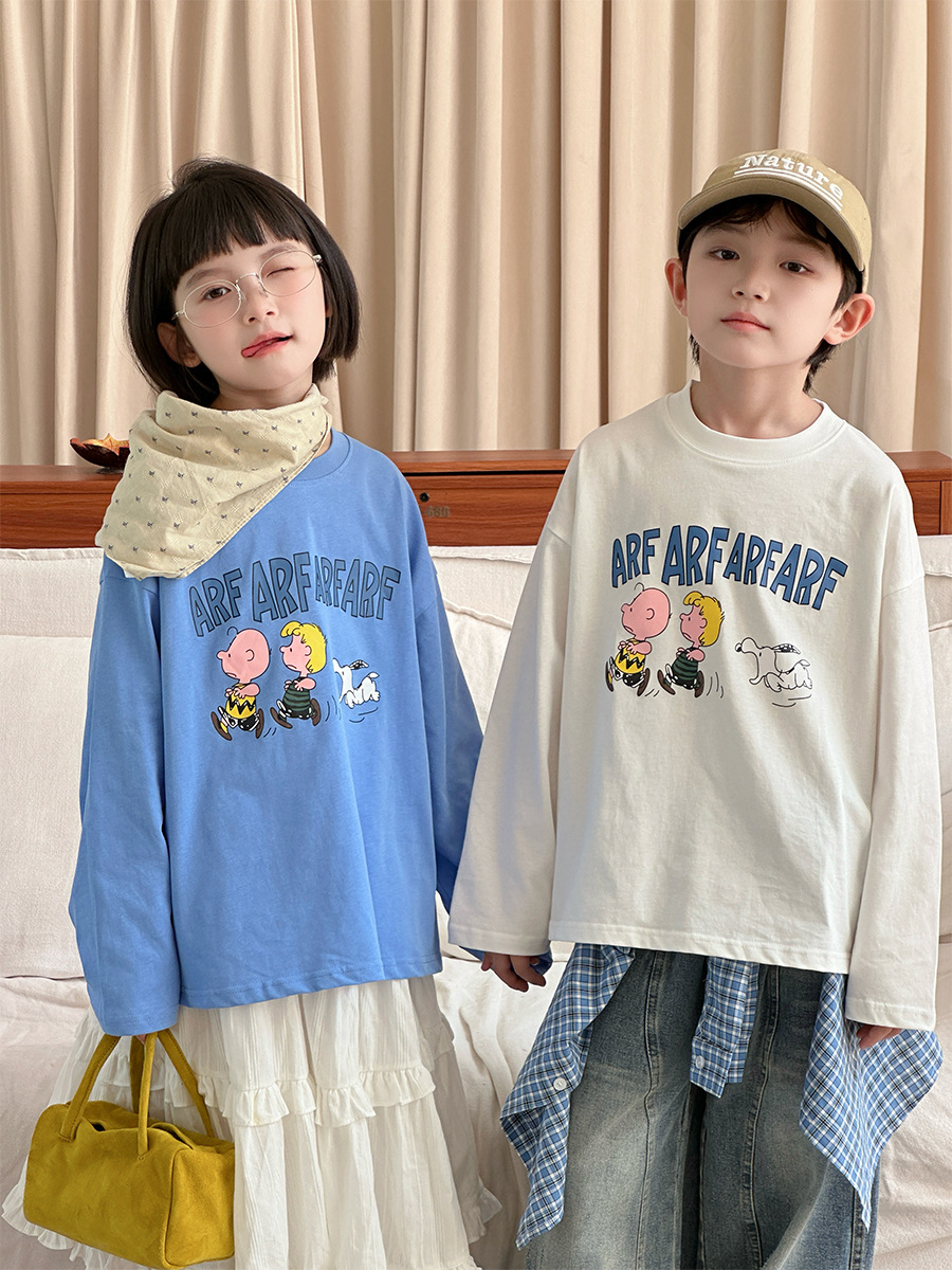 2025 새로운 가을 한국어 버전 어린이 만화 프린트 긴팔 소년과 소녀 뒷면 문자 바닥 셔츠 티셔츠 탑스토어 가기