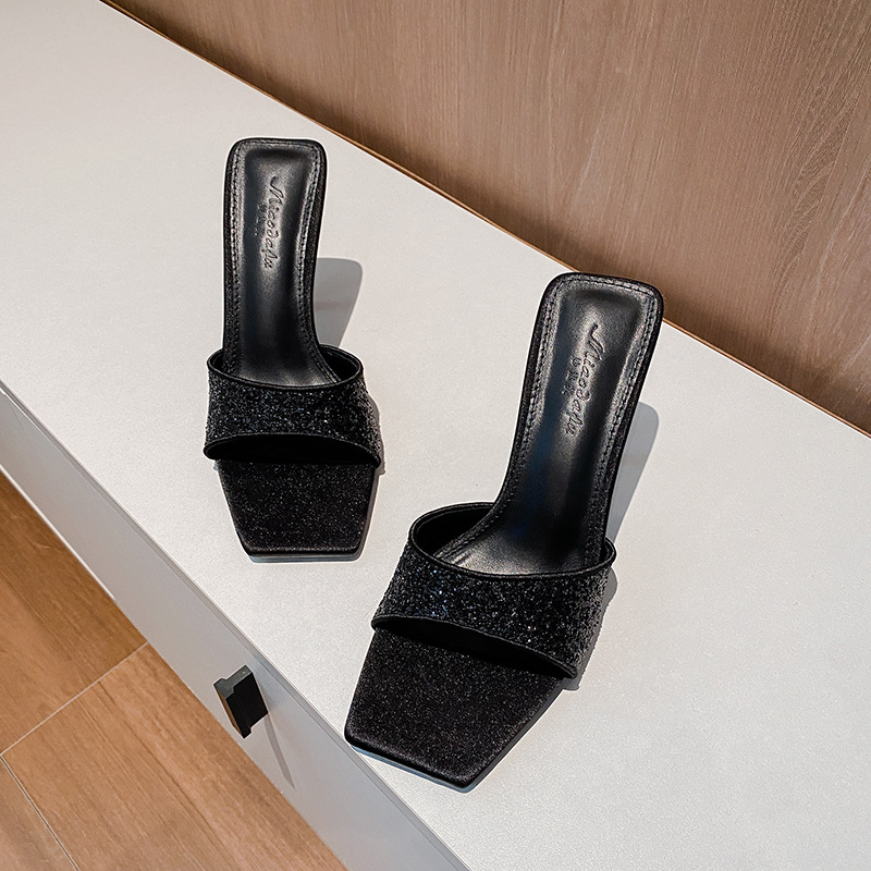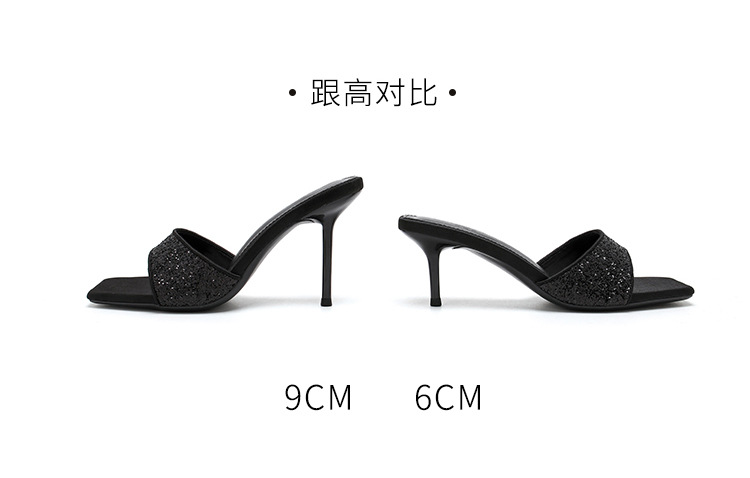 2026년 신상 여성용 사각코 블랙 글리터 하이힐 슬리퍼, 얇은 굽의 요정 스타일, 원스트랩 오픈토 샌들, 여성용 여름 샌들