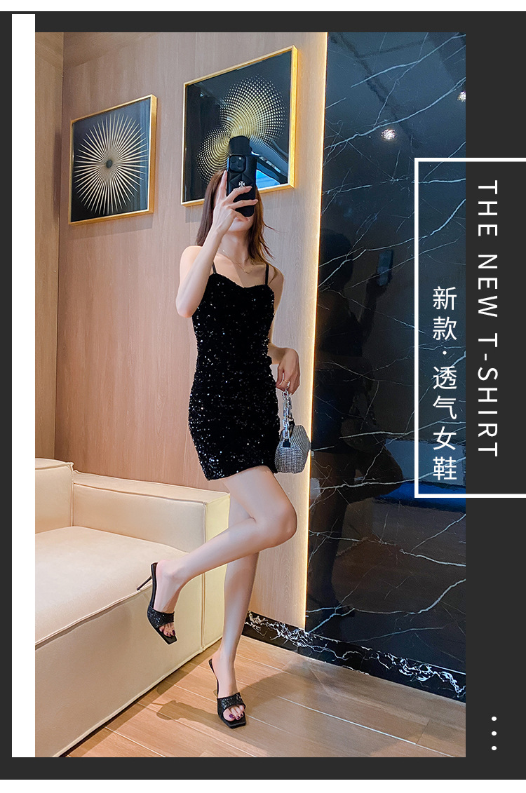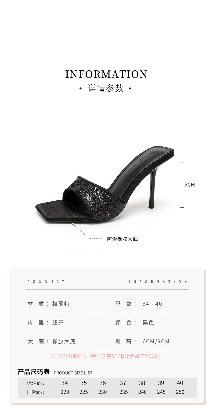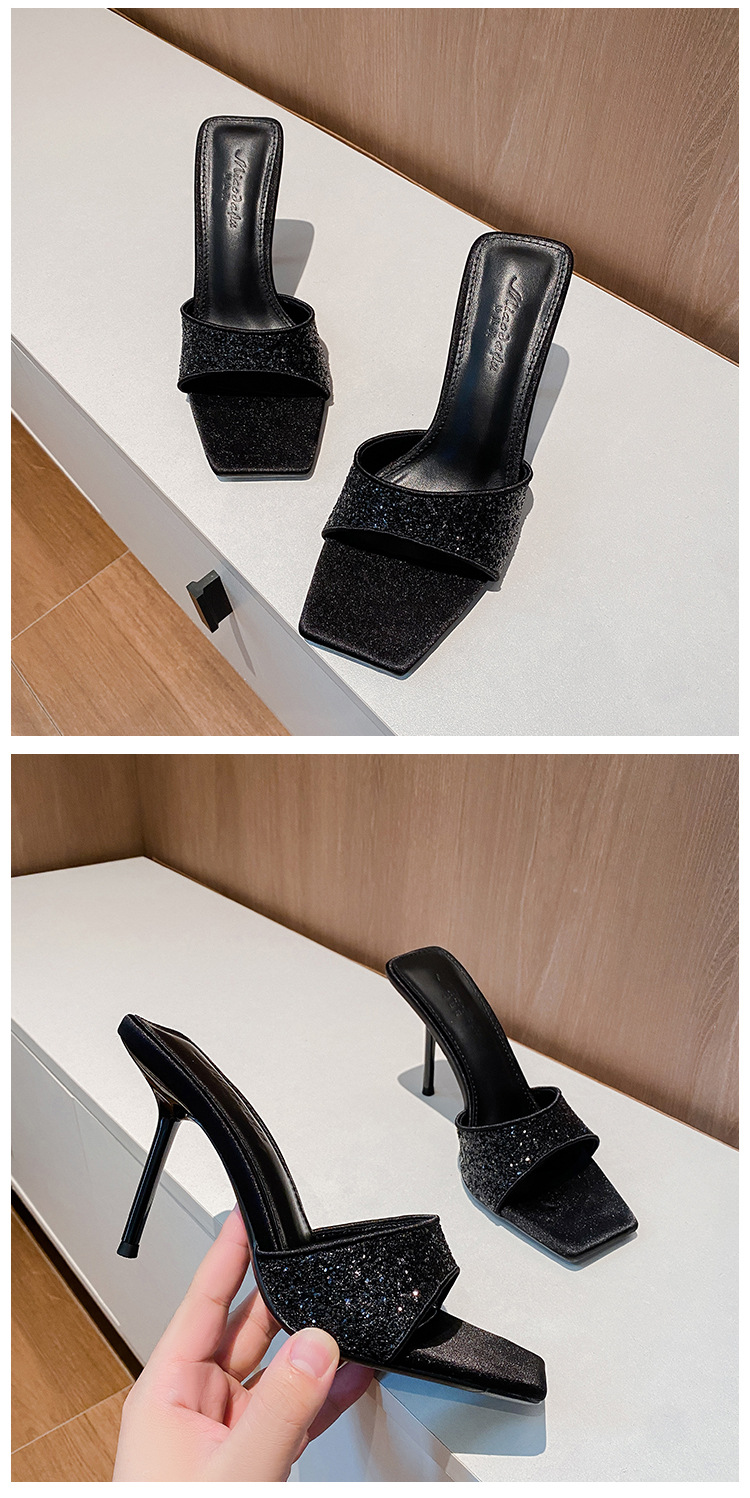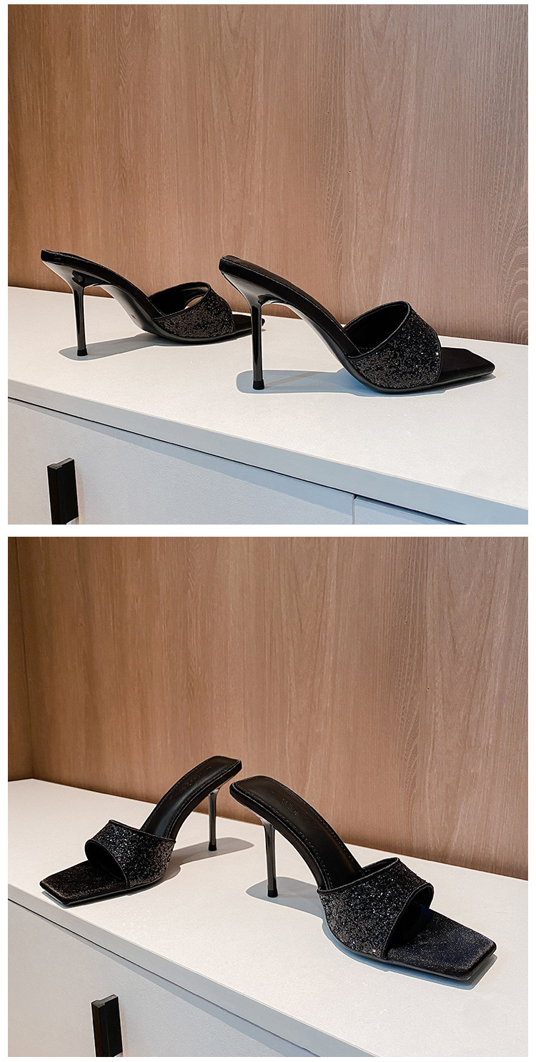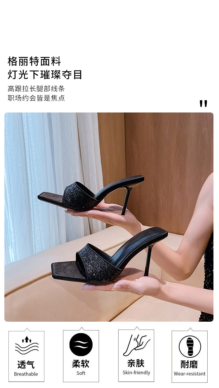 2026년 신상 여성용 사각코 블랙 글리터 하이힐 슬리퍼, 얇은 굽의 요정 스타일, 원스트랩 오픈토 샌들, 여성용 여름 샌들스토어 가기