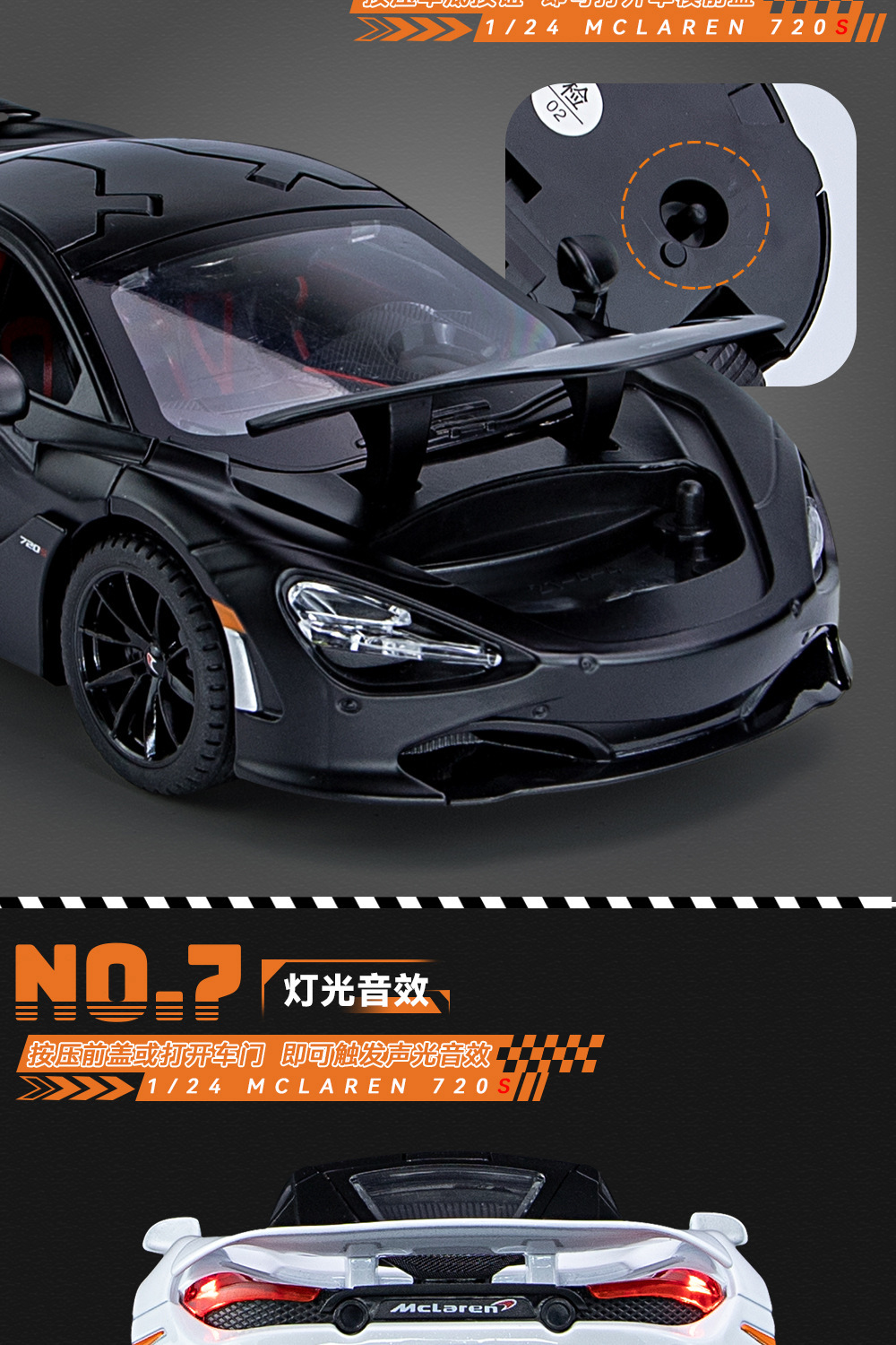 1:24 시뮬레이션 McLaren 720S 합금 스포츠카 모델 소리와 빛 풀백 소년 장난감 장식품 Chengehai 도매
