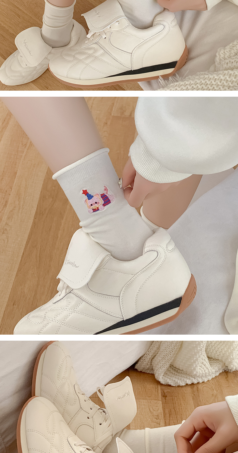 흰색 자수 양말, 작은 가죽 신발이 달린 여성용 종아리 중간 양말, 트렌디하고 통기성이 뛰어난 한국식 만화 귀여운 봄, 가을 양말, 면 양말