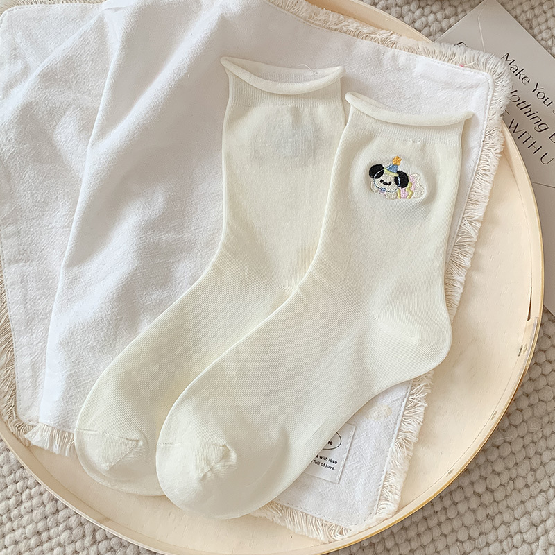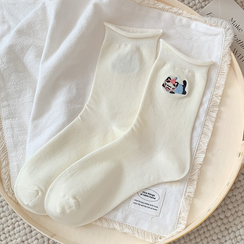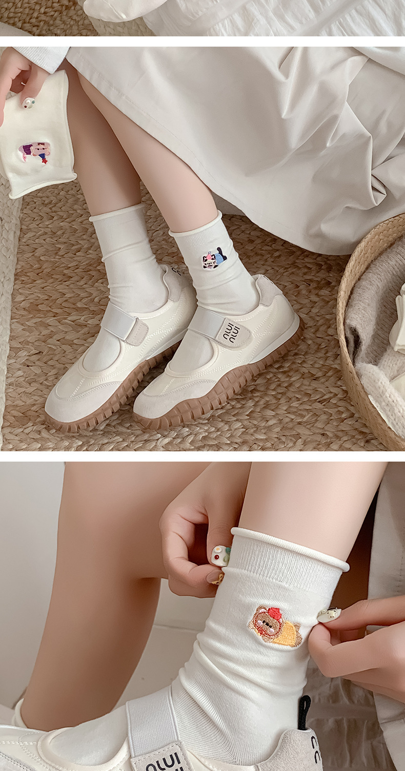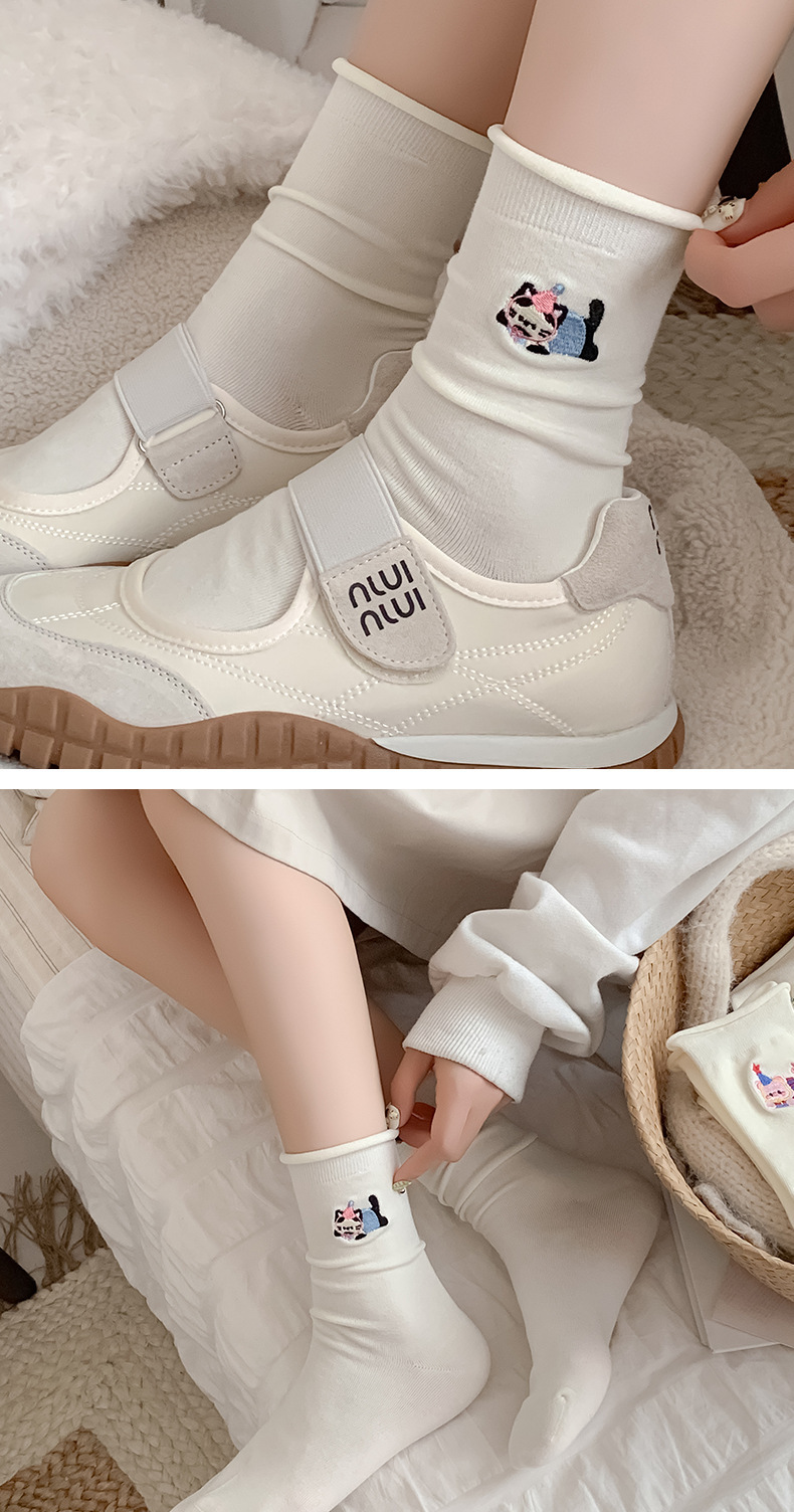 흰색 자수 양말, 작은 가죽 신발이 달린 여성용 종아리 중간 양말, 트렌디하고 통기성이 뛰어난 한국식 만화 귀여운 봄, 가을 양말, 면 양말스토어 가기