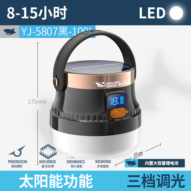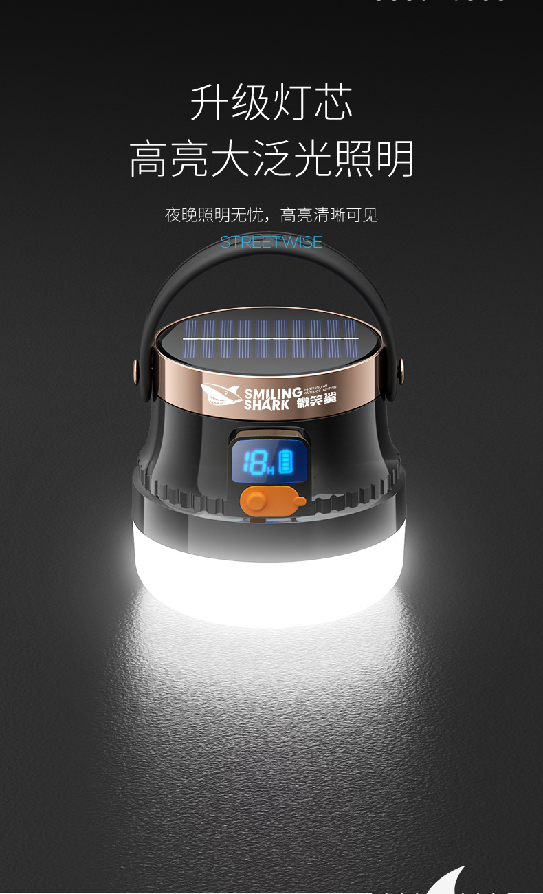 스마일 샤크 야외 조명 태양열 충전 캠핑 라이트 야시장 스톨 라이트 디지털 디스플레이가있는 대용량 배터리 수명스토어 가기