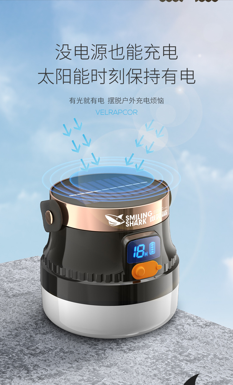 스마일 샤크 야외 조명 태양열 충전 캠핑 라이트 야시장 스톨 라이트 디지털 디스플레이가있는 대용량 배터리 수명