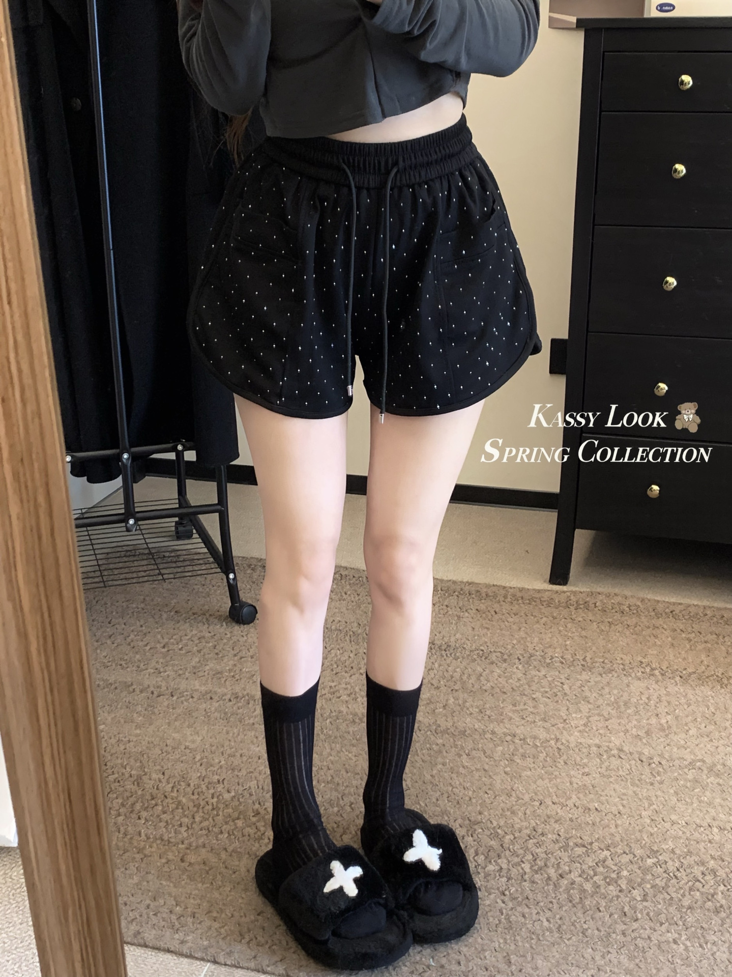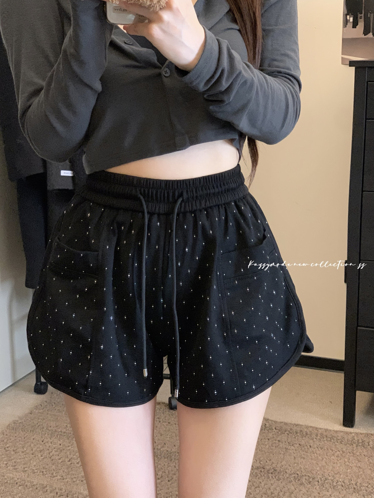 블랙 디자인 틈새 핫 다이아몬드 핫팬츠 캐주얼 바지 여성 여름 하이웨이스트 루즈 스포츠 팬츠 와이드 팬츠 반바지