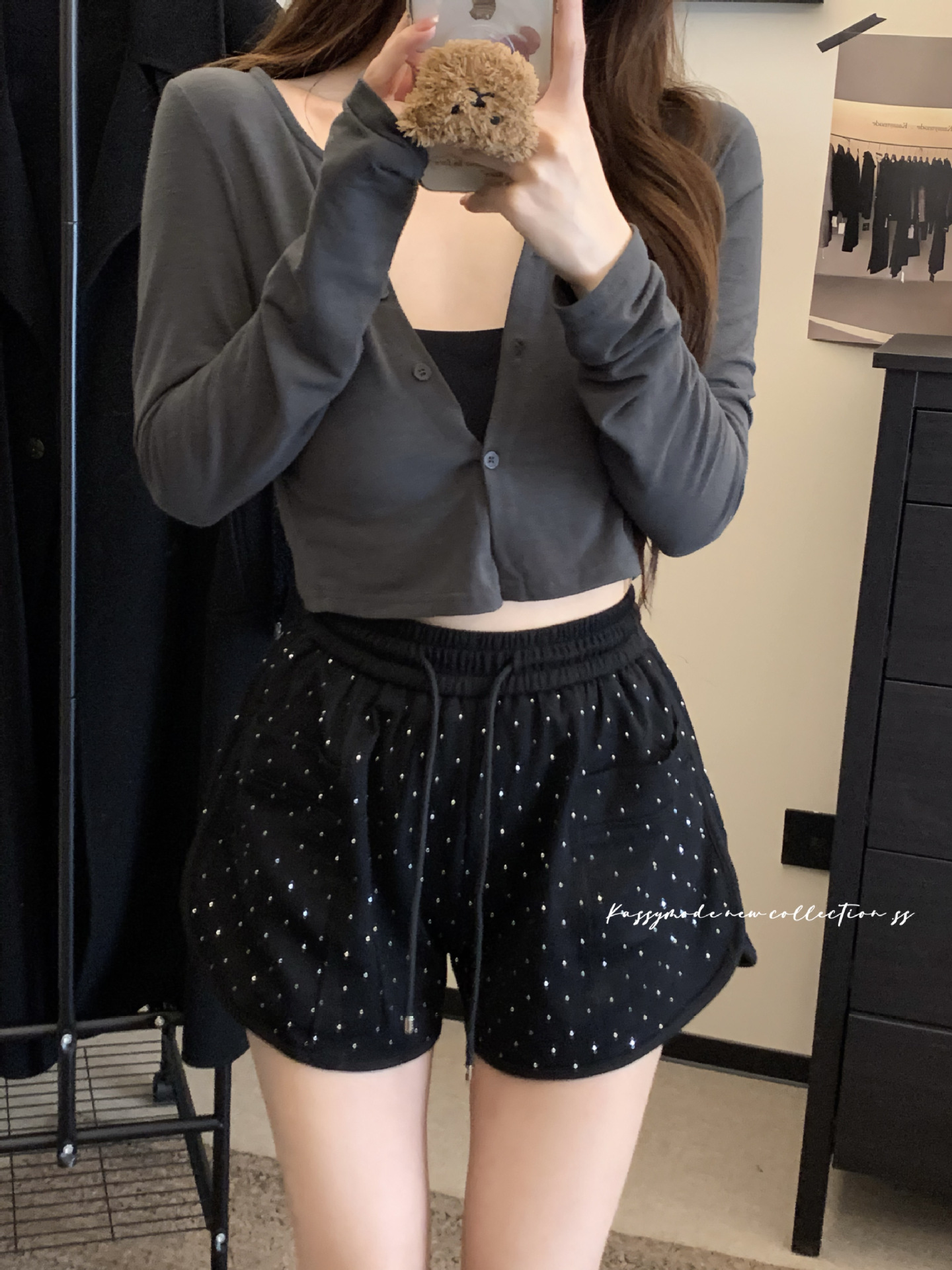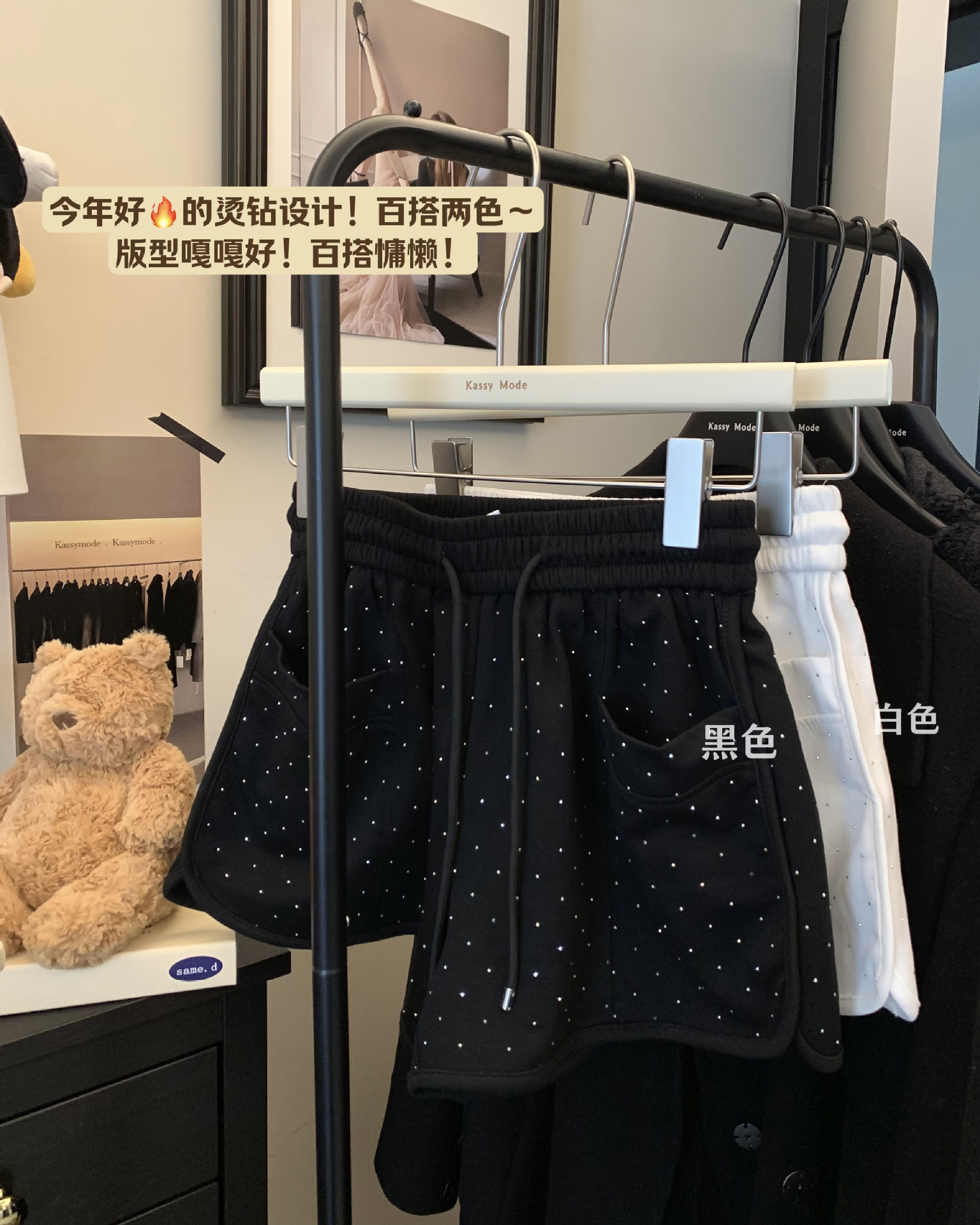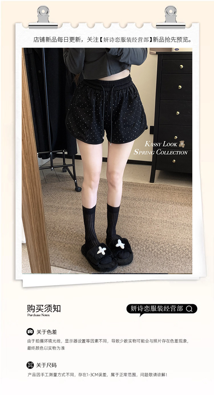 블랙 디자인 틈새 핫 다이아몬드 핫팬츠 캐주얼 바지 여성 여름 하이웨이스트 루즈 스포츠 팬츠 와이드 팬츠 반바지스토어 가기
