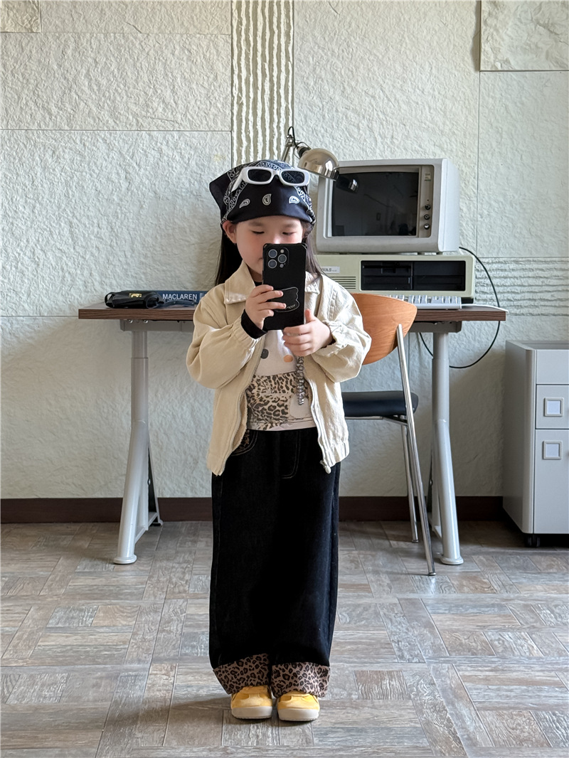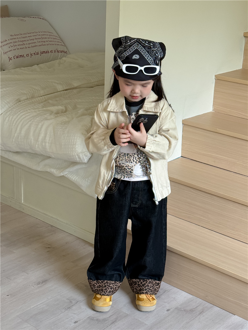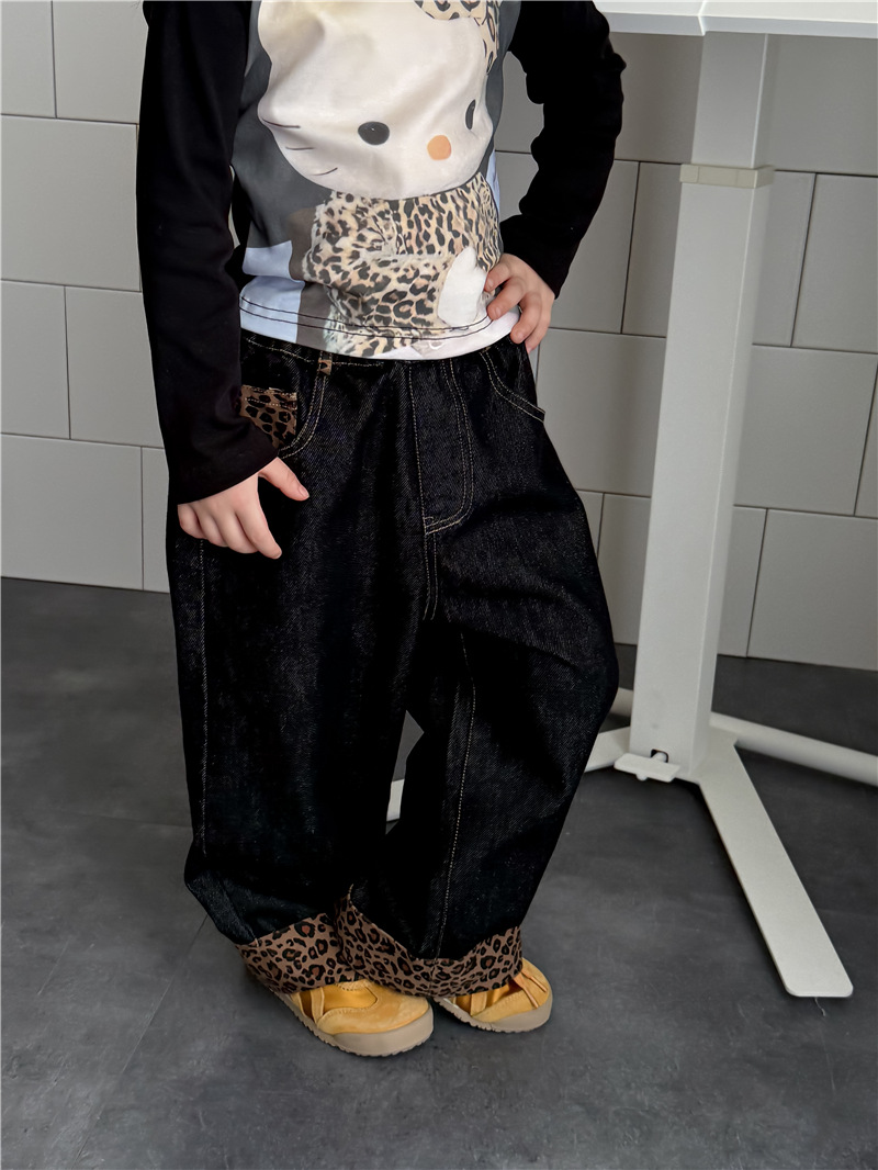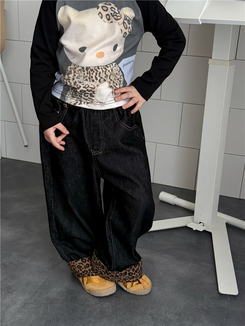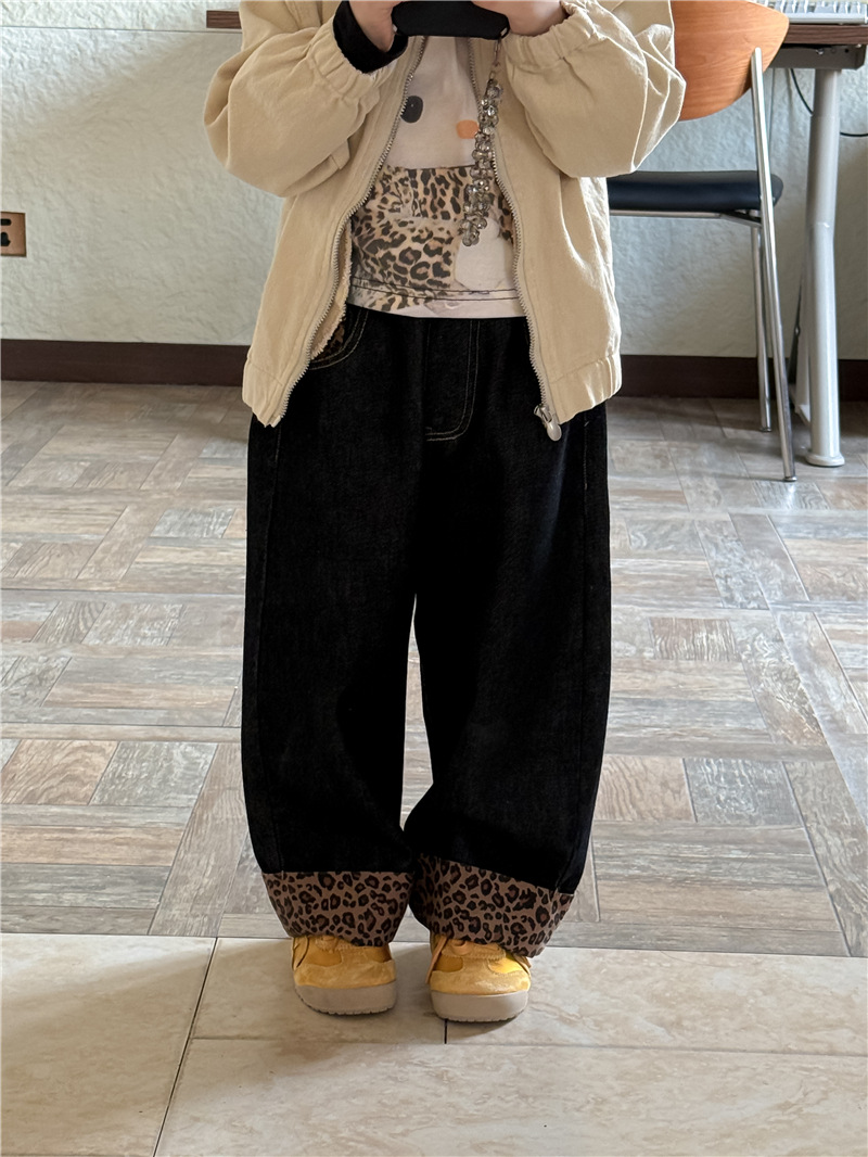 Sweet Tea Mom Girls 2025 가을 신작 데님 캐주얼 바지 아기 유치원 봄, 가을 다목적 레오파드 프린트 스플 라이스 바지스토어 가기