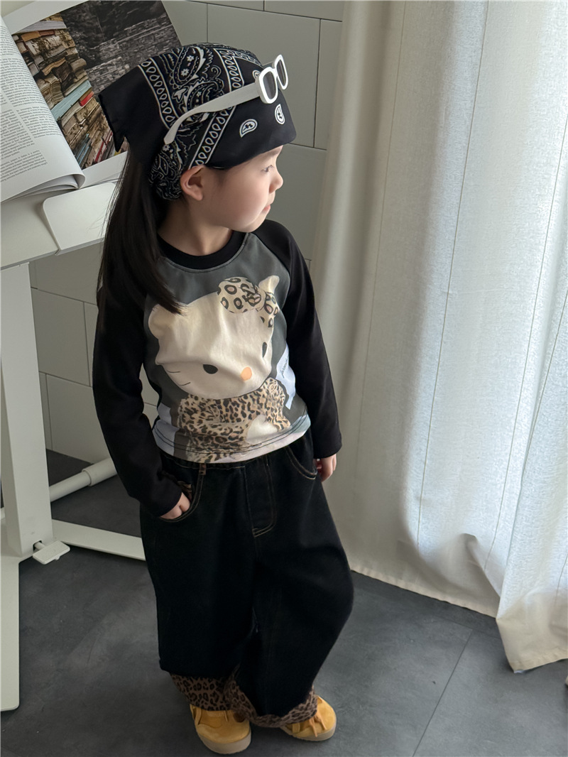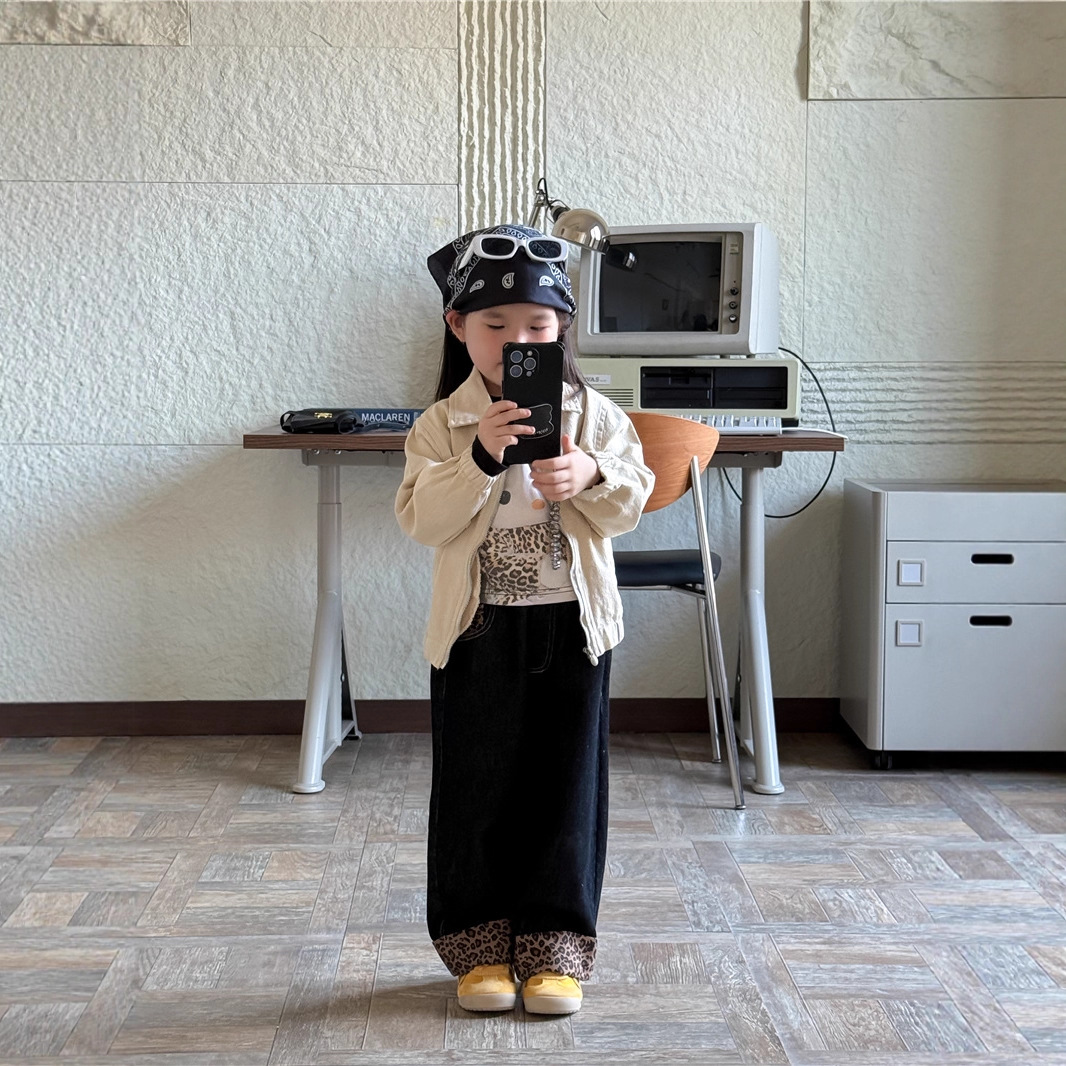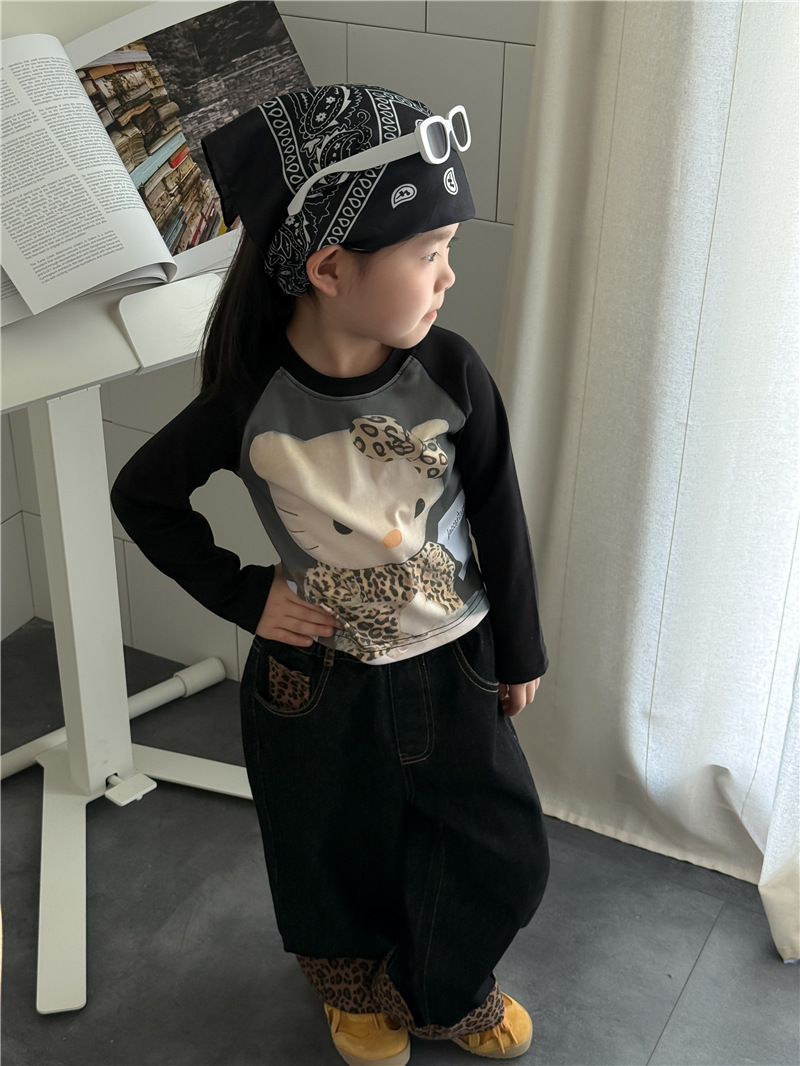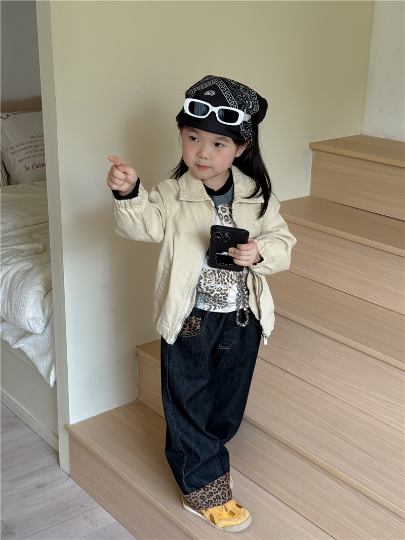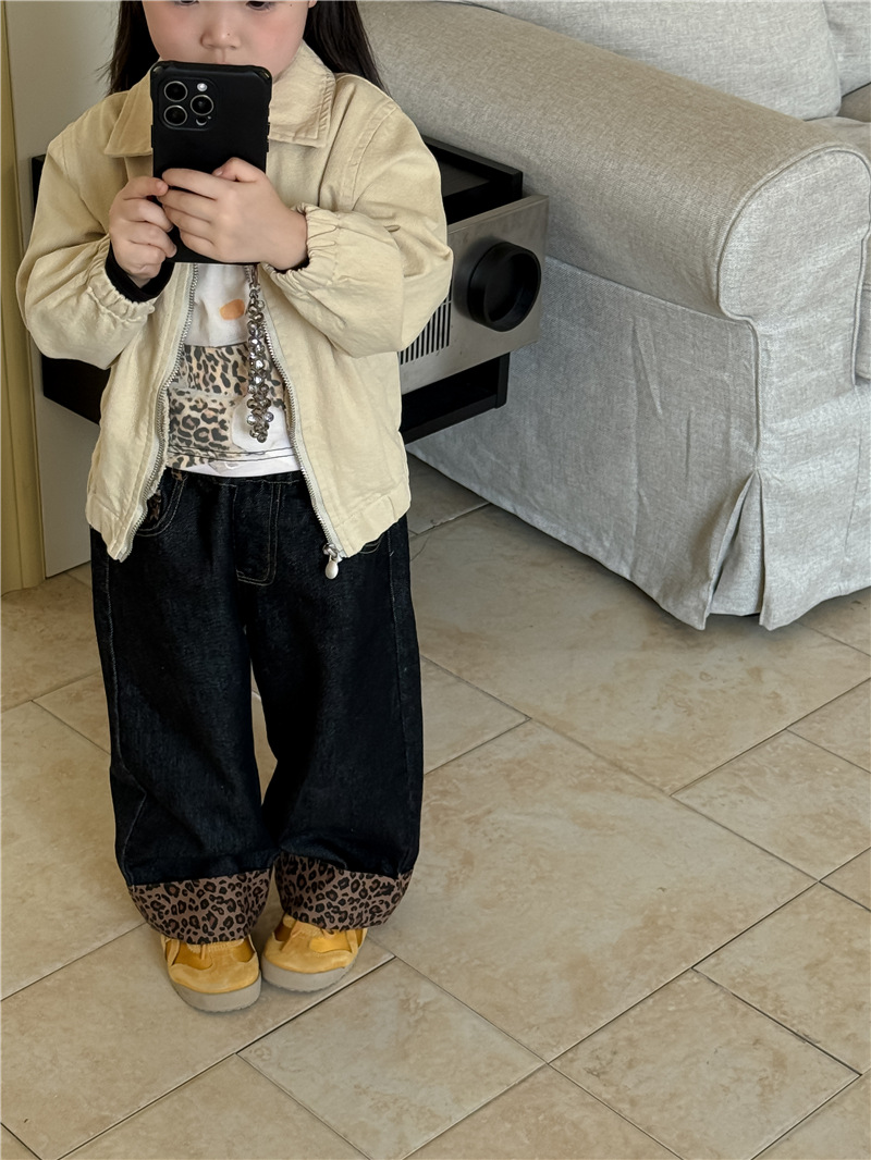 Sweet Tea Mom Girls 2025 가을 신작 데님 캐주얼 바지 아기 유치원 봄, 가을 다목적 레오파드 프린트 스플 라이스 바지스토어 가기