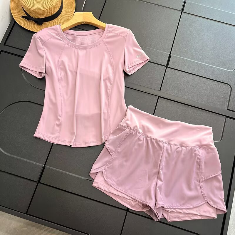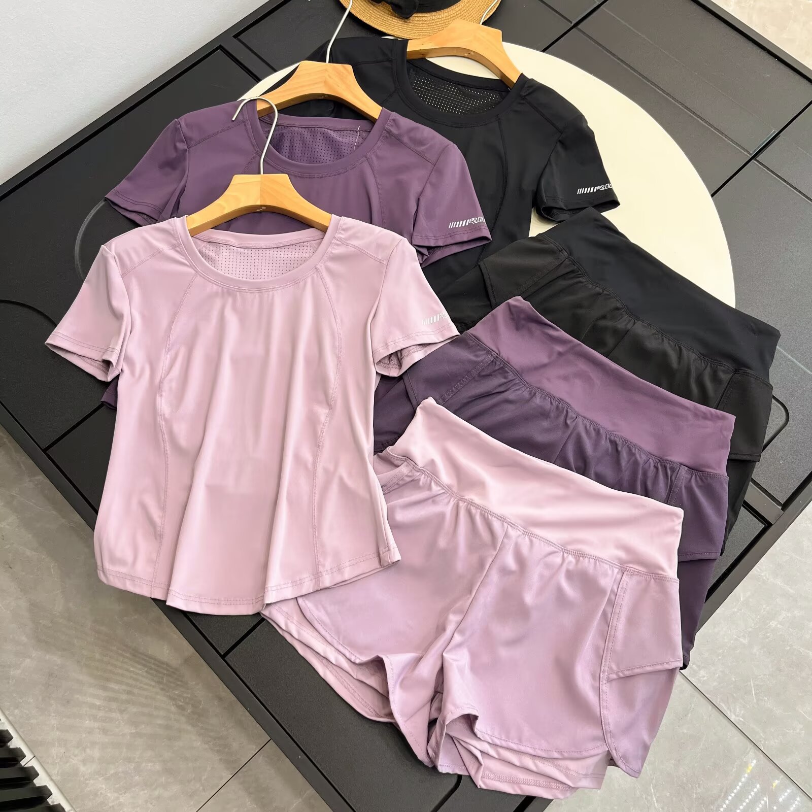 2025 여름 경량 속건성 메쉬 통기성 라운드 넥 반팔 피트니스 요가 반바지 여성용 세트