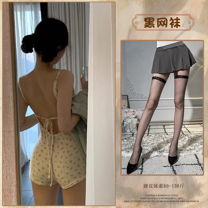 • 꽃무늬 점프수트(뒷면 레이스업) + 블랙 망사스타킹
