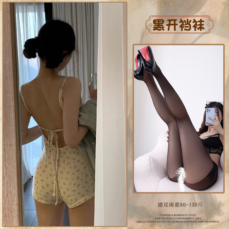 • 꽃무늬 점프수트(뒷면에 가슴 패드 포함) + 블랙 가랑이 없는 스타킹
