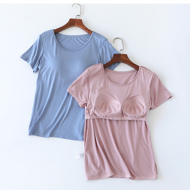 여름용 가슴 패드가 있는 여성용 반팔 셔츠, 브라컵이 없는 원피스 반팔 셔츠, 모달 탑, 슬림핏스토어 가기