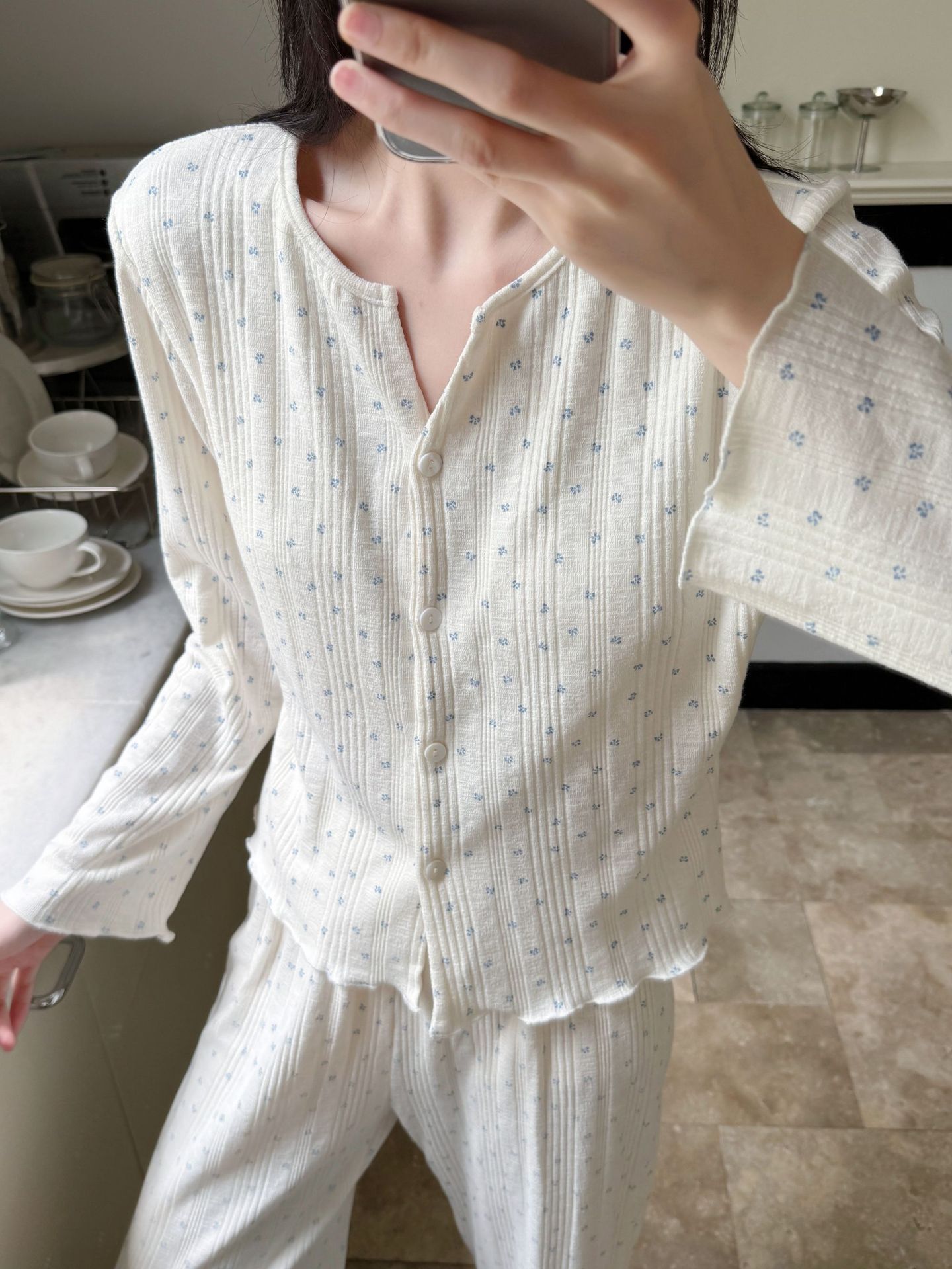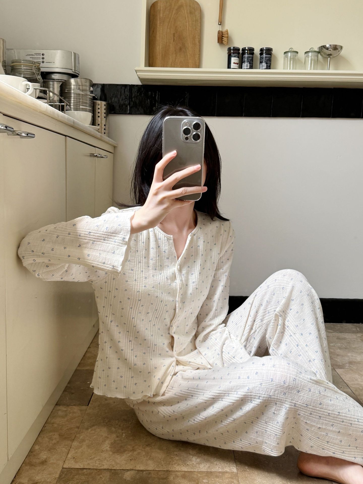가슴 패드가있는 여성용 가을, 겨울 새 스타일 긴팔 바지 탄성 달콤한 꽃 무늬 느슨한 두꺼운 가정 의류 세트스토어 가기