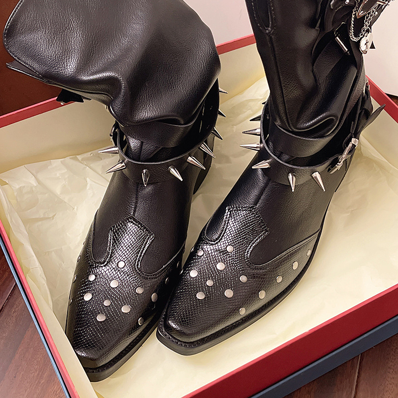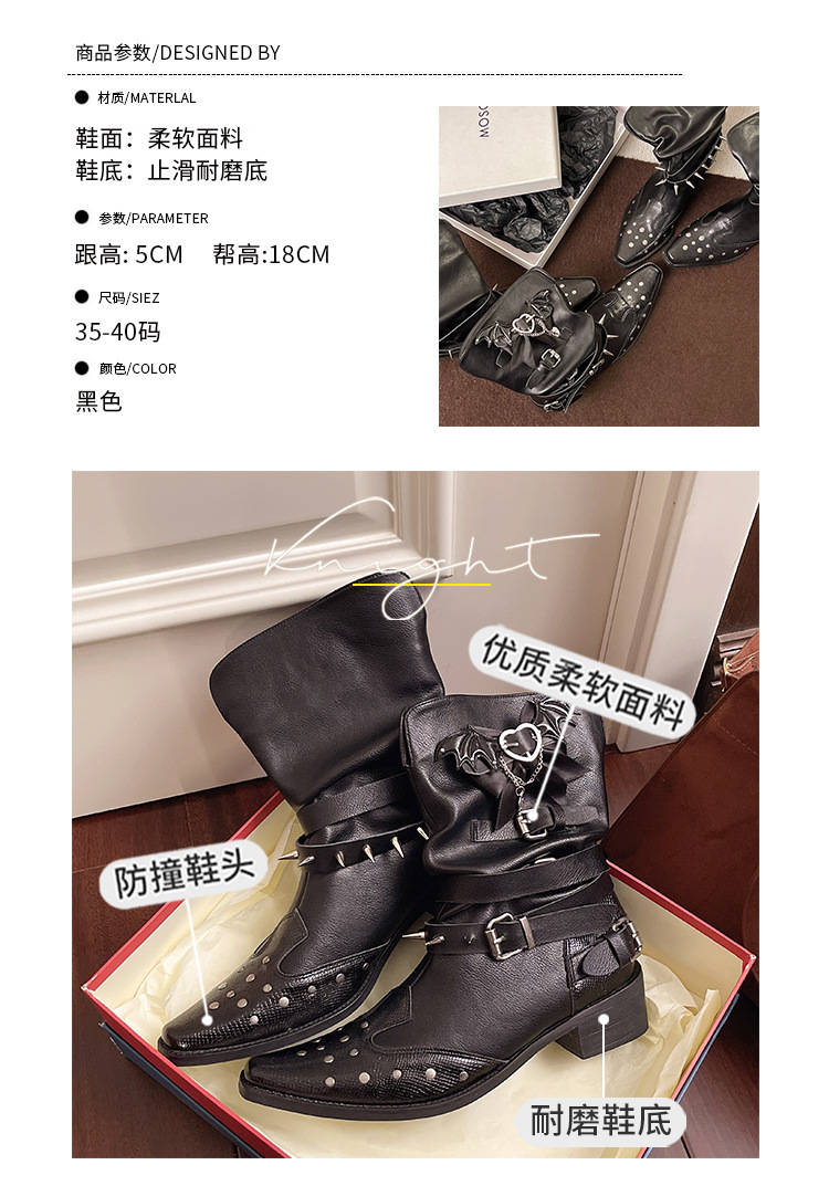 여름 여성용 플리츠 웨스턴 숏부츠, 브리티시 스타일, 포인티드 토, V컷, 슬림, 두꺼운 굽, 블랙 니치 리벳 나이트 부츠스토어 가기