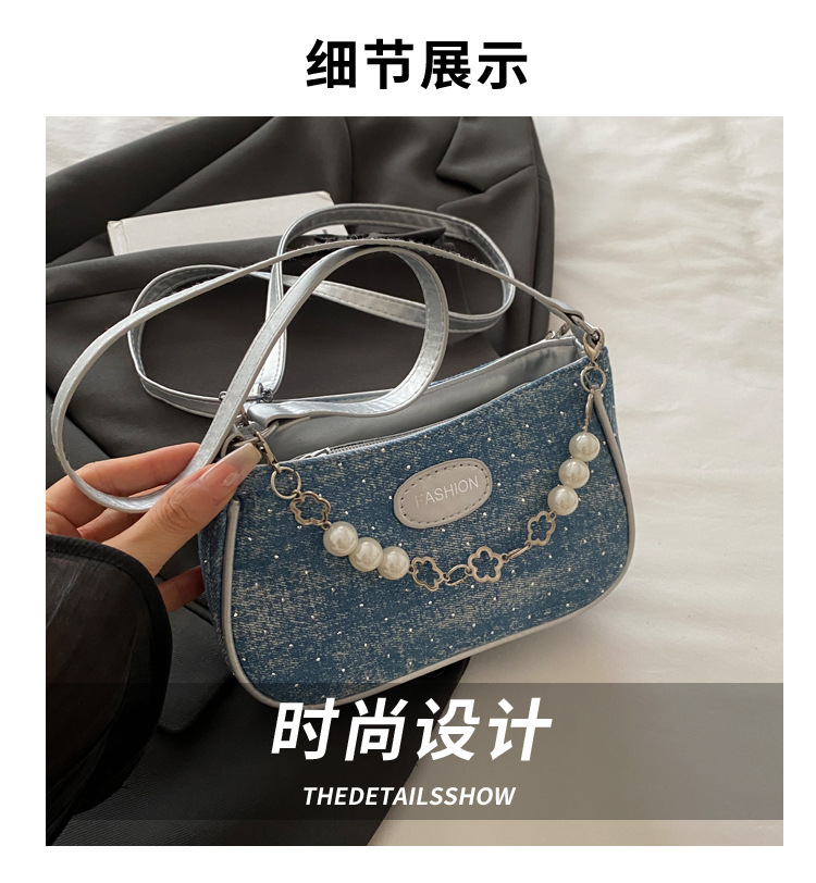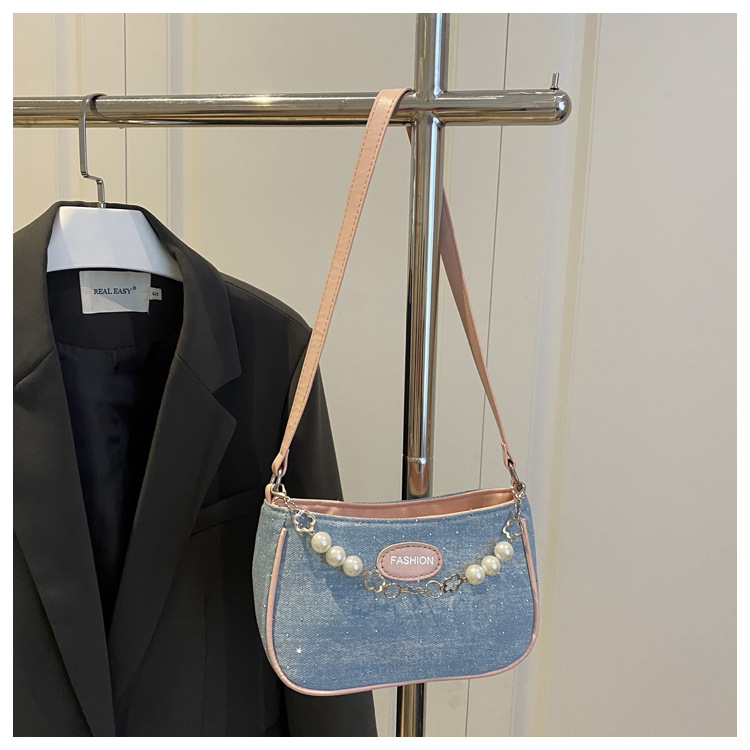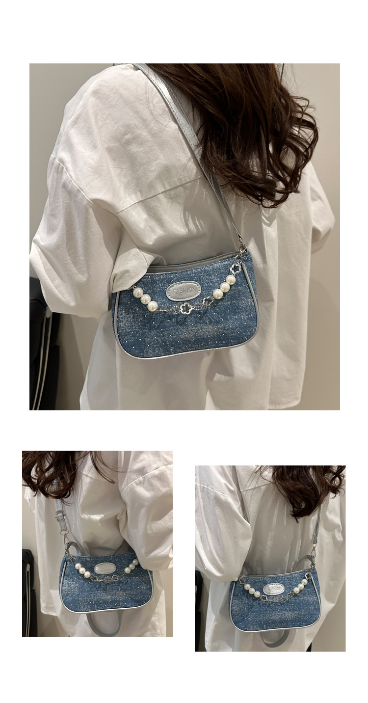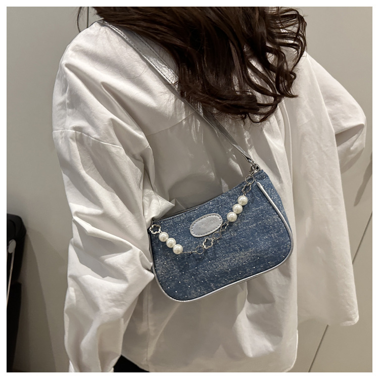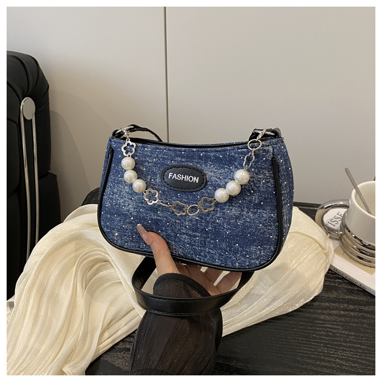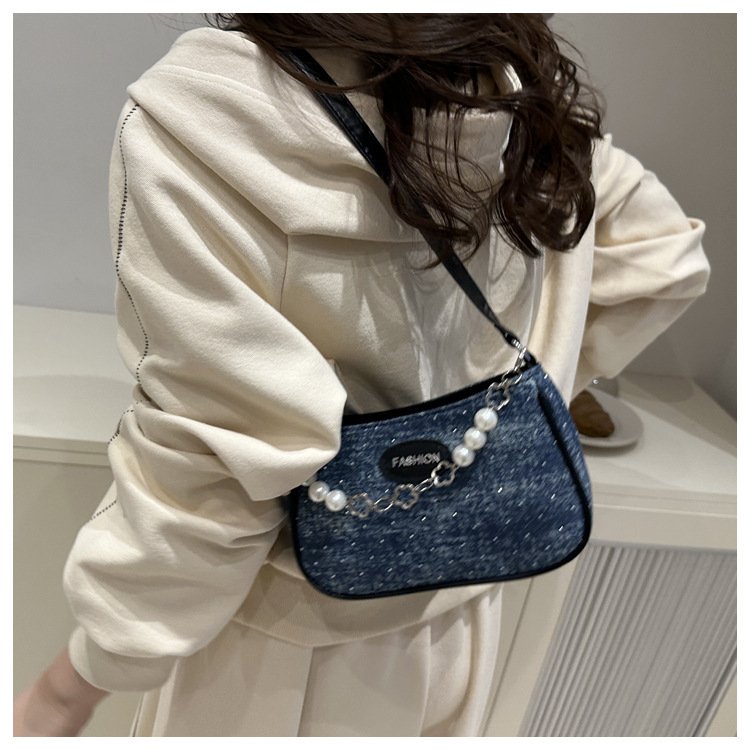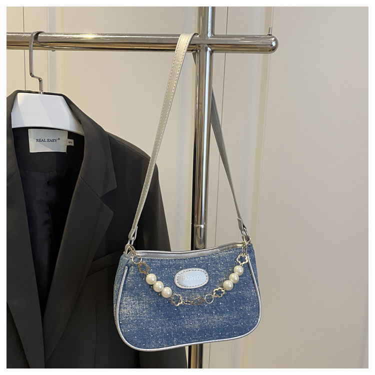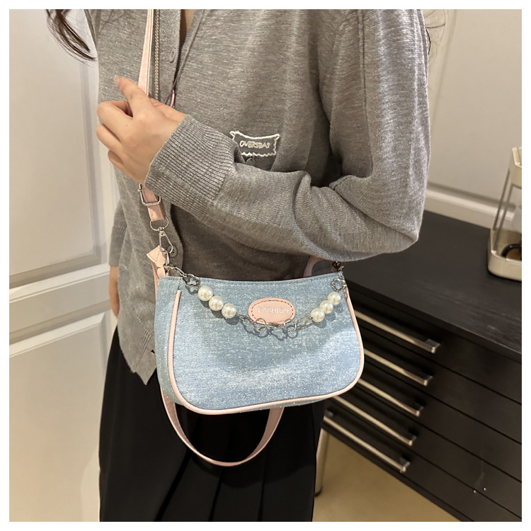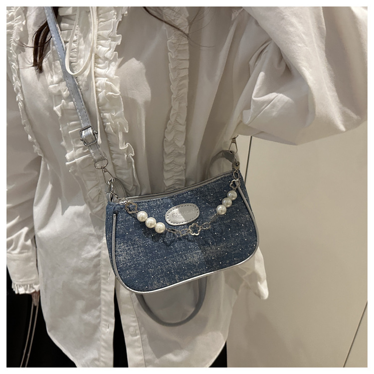 데님은 올해 인기 2025 새로운 패션 심플한 진주 체인 서양식 크로스바디 싱글 숄더 겨드랑이 작은 사각형 가방