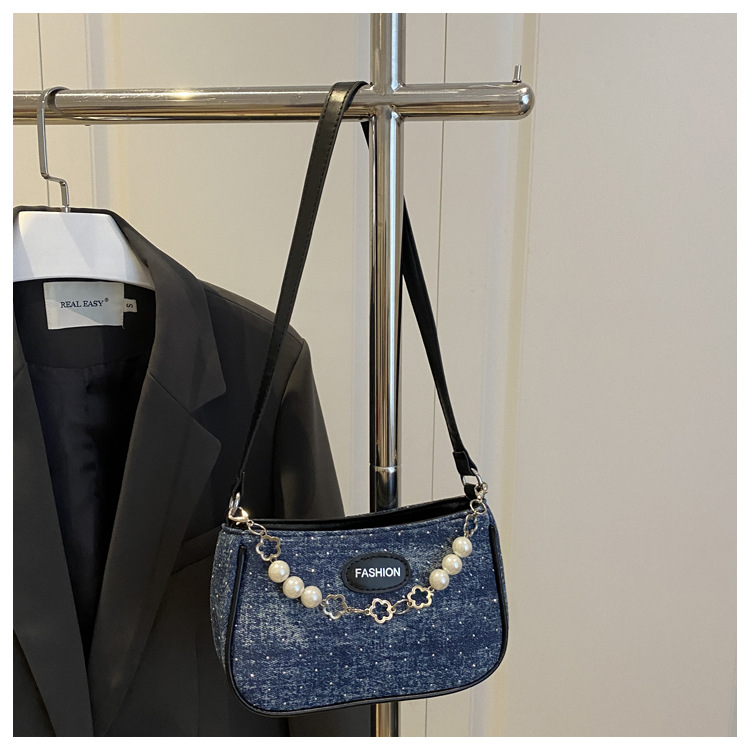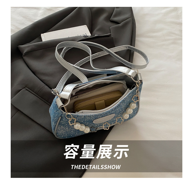 데님은 올해 인기 2025 새로운 패션 심플한 진주 체인 서양식 크로스바디 싱글 숄더 겨드랑이 작은 사각형 가방스토어 가기