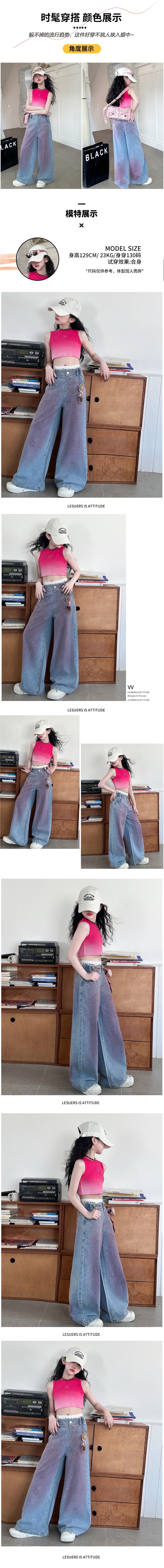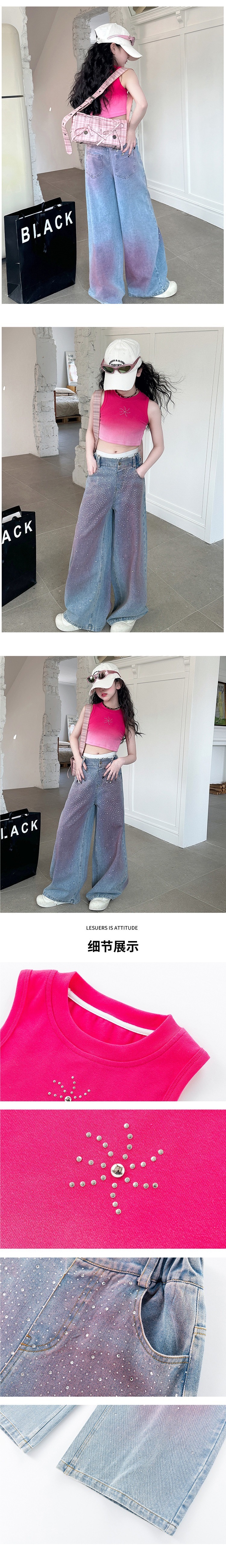 여아 핫 다이아몬드 슈트 2025 여름 한국 스타일 핫 다이아몬드 슬림 와이드 레그 청바지 펜던트 염색 조끼 투피스 세트