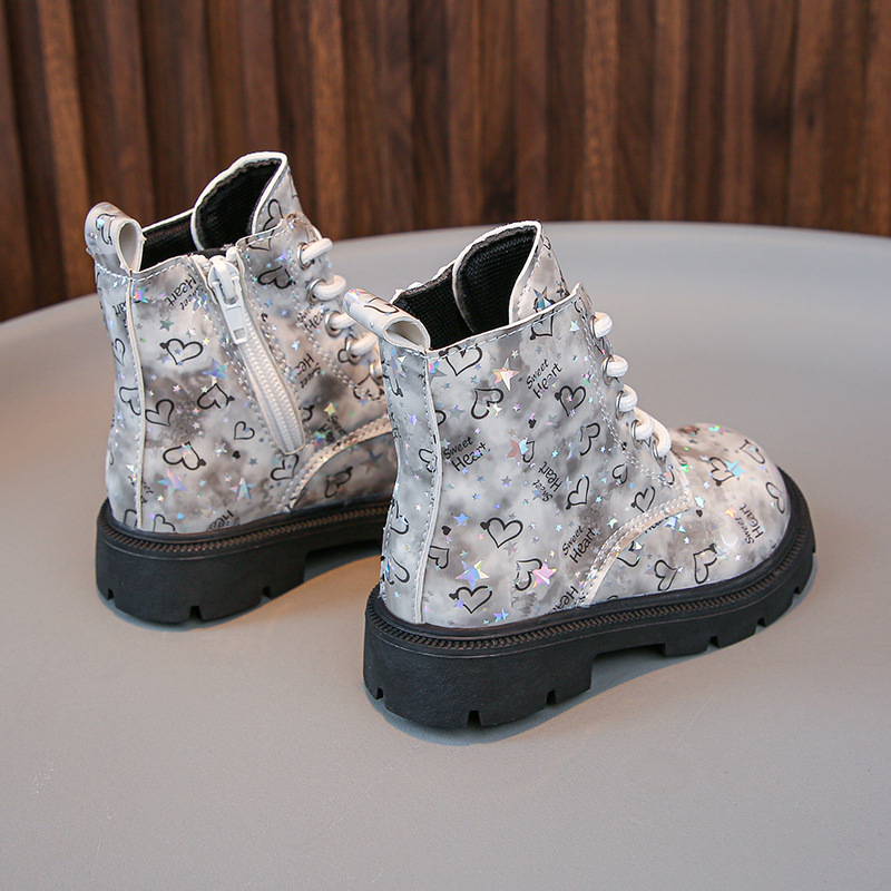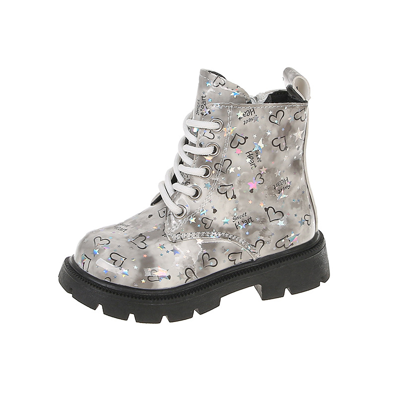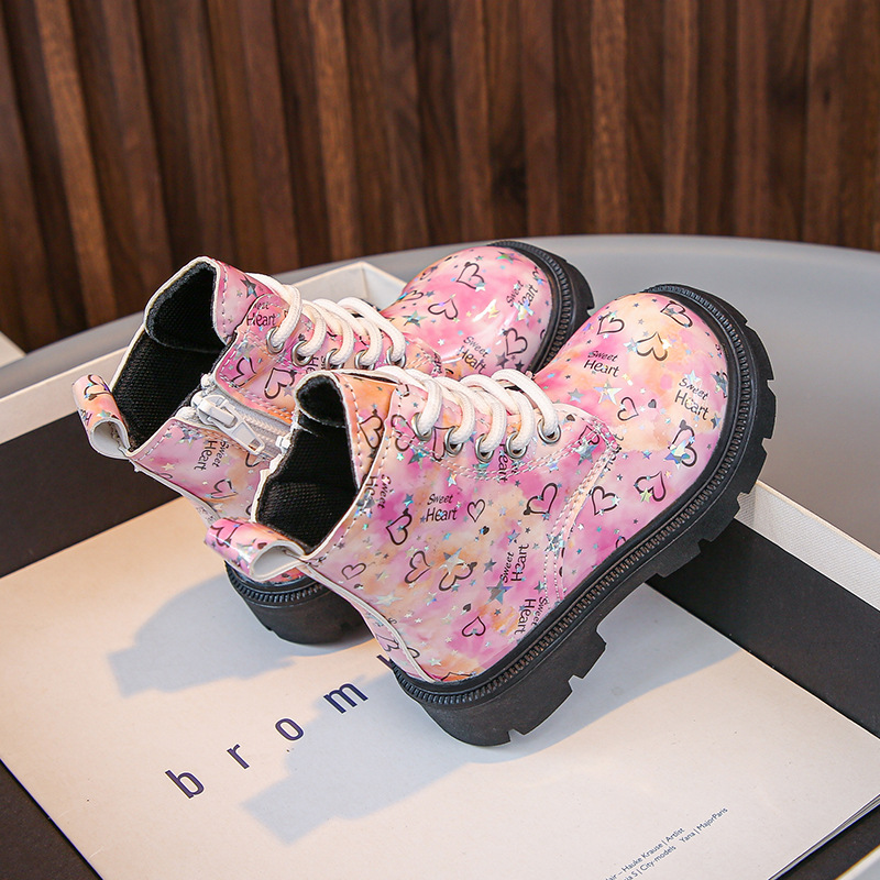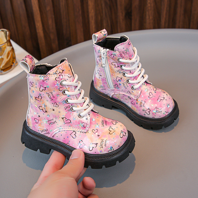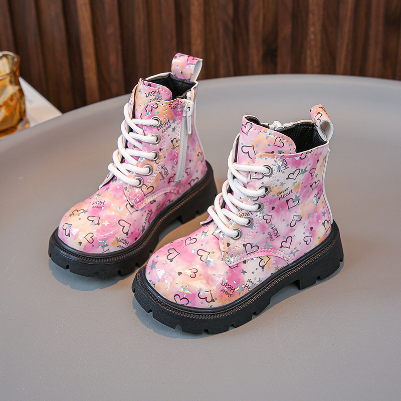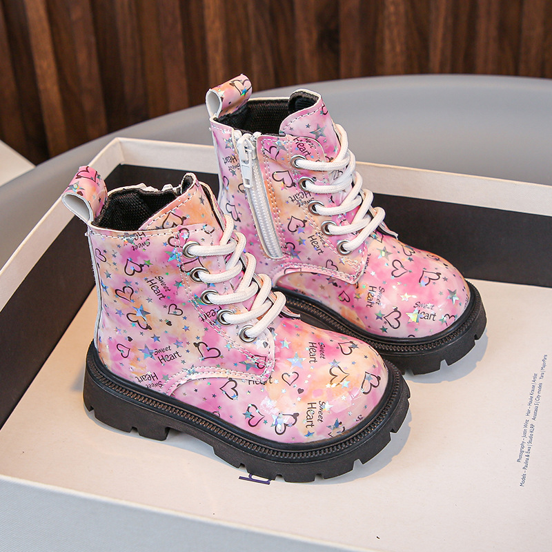 2025 새로운 가을, 겨울 밝은 가죽 인쇄 어린이 마틴 부츠 소녀 둥근 발가락 중간 튜브 가죽 부츠 소년 부츠 유행 크로스 보더스토어 가기