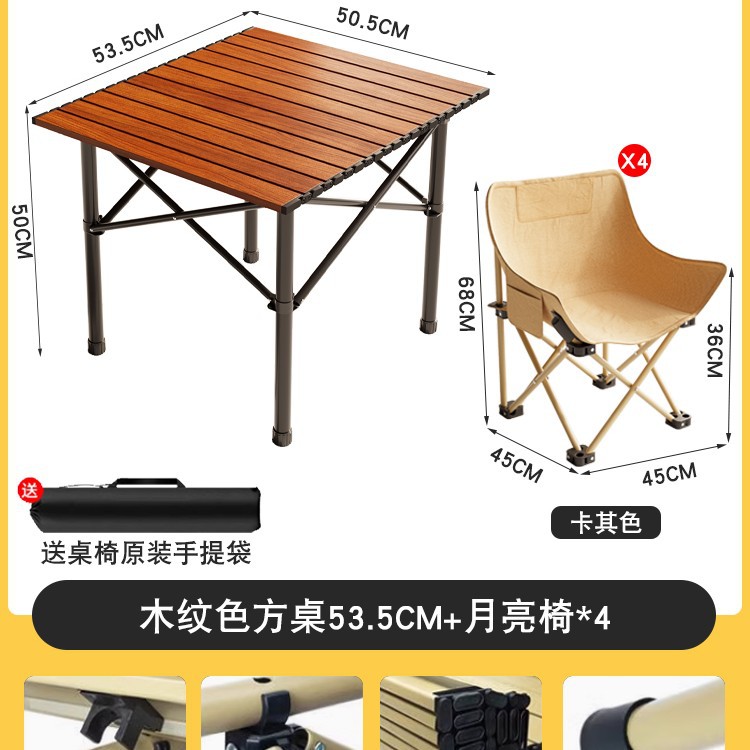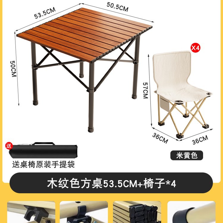 • [두꺼운 X자형 탄소강] 우드그레인 컬러 사각 테이블 53cm + 문체어 4개, 휴대용 수납가방 포함☆♢